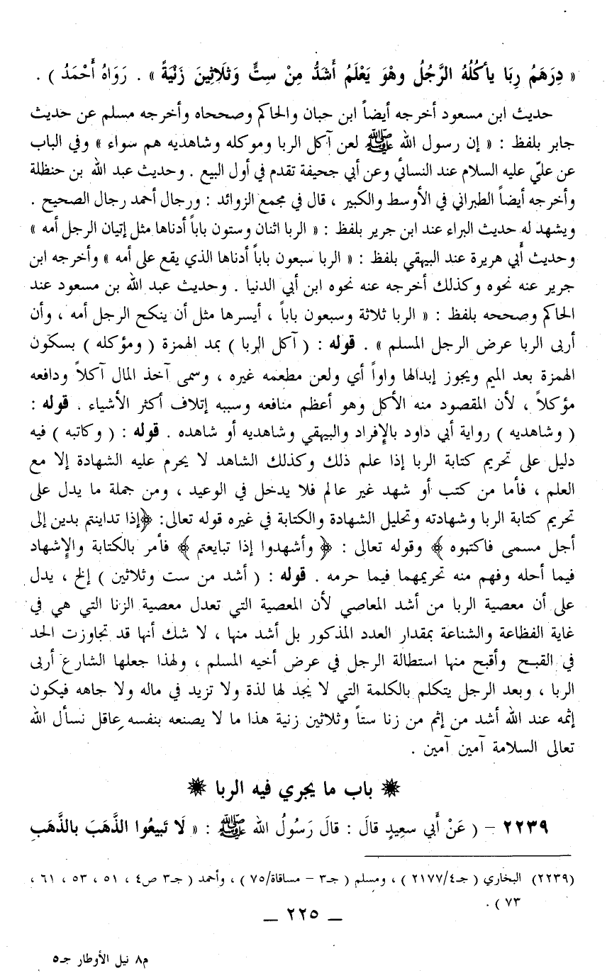 «دِرْهَمُ رِبًا يَأْكُلُهُ الرَّجُلُ وَهُوَ يَعْلَمُ أَشَدُّ مِنْ سِتٍّ وَثَلَاثِينَ زَنْيَةً» رَوَاهُ أَحْمَدُ) . حَدِيثُ ابْنِ مَسْعُودٍ. أَخْرَجَهُ أَيْضًا ابْنُ حِبَّانَ وَالْحَاكِمُ وَصَحَّحَاهُ وَأَخْرَجَهُ مُسْلِمٌ عَنْ حَدِيثِ جَابِرٍ بِلَفْظِ: «إنَّ رَسُولَ اللَّهِ - صَلَّى اللَّهُ عَلَيْهِ وَسَلَّمَ - لَعَنَ آكِلَ الرِّبَا وَمُوكِلَهُ وَشَاهِدَيْهِ هُمْ سَوَاءٌ»
