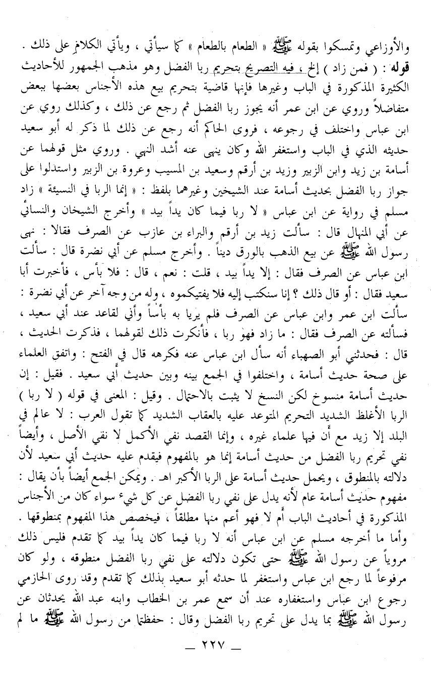 وَإِنَّمَا الْقَصْدُ نَفْيُ الْأَكْمَلِ لَا نَفْيُ الْأَصْلِ، وَأَيْضًا نَفْيُ تَحْرِيمِ رِبَا الْفَضْلِ مِنْ حَدِيثِ أُسَامَةَ إنَّمَا هُوَ بِالْمَفْهُومِ فَيُقَدَّمُ عَلَيْهِ حَدِيثُ أَبِي سَعِيدٍ؛ لِأَنَّ دَلَالَتَهُ بِالْمَنْطُوقِ، وَيُحْمَلُ حَدِيثُ أُسَامَةَ عَلَى الرِّبَا الْأَكْبَرِ اهـ.