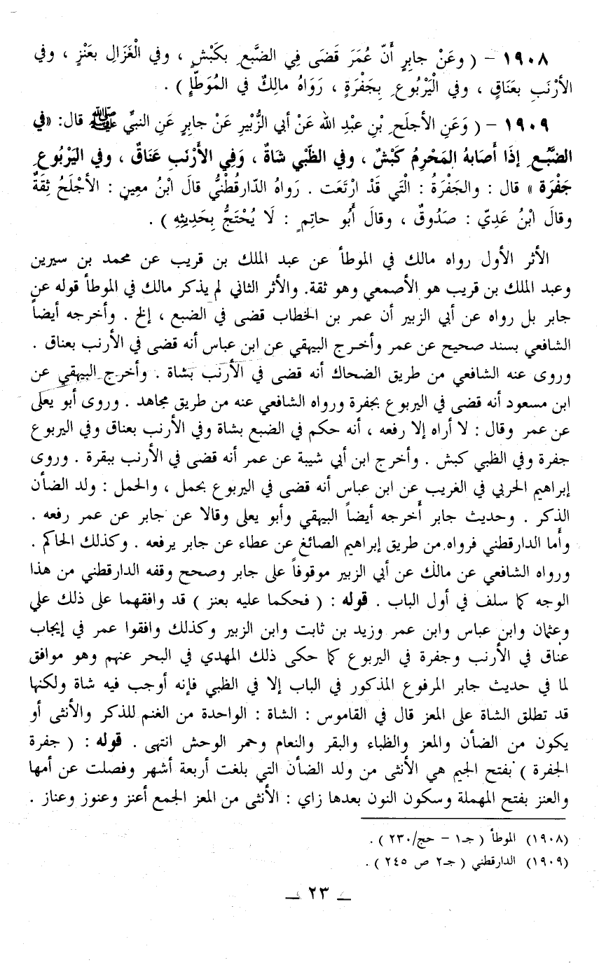 1909 - (وَعَنْ الْأَجْلَحِ بْنِ عَبْدِ اللَّهِ عَنْ أَبِي الزُّبَيْرِ عَنْ جَابِرٍ عَنْ النَّبِيِّ - صَلَّى اللَّهُ عَلَيْهِ وَسَلَّمَ - قَالَ: «فِي الضَّبُعِ إذَا أَصَابَهُ الْمُحْرِمُ كَبْشٌ، وَفِي الظَّبْيِ شَاةٌ، وَفِي الْأَرْنَبِ عَنَاقٌ، وَفِي الْيَرْبُوعِ جَفْرَةٌ» قَالَ: وَالْجَفْرَةُ: الَّتِي قَدْ أَرْتَعَتْ. رَوَاهُ الدَّارَقُطْنِيّ قَالَ ابْنُ مَعِينٍ: الْأَجْلَحُ ثِقَةٌ وَقَالَ ابْنُ عَدِيٍّ: صَدُوقٌ، وَقَالَ أَبُو حَاتِمٍ: لَا يُحْتَجُّ بِحَدِيثِهِ) الْأَثَرُ الْأَوَّلُ رَوَاهُ مَالِكٌ فِي الْمُوَطَّأِ عَنْ عَبْدِ الْمَلِكِ بْنِ قُرَيْبٍ عَنْ مُحَمَّدِ بْنِ سِيرِينَ وَعَبْدُ الْمَلِكِ بْنُ قُرَيْبٍ هُوَ الْأَصْمَعِيُّ وَهُوَ ثِقَةٌ، وَالْأَثَرُ الثَّانِي لَمْ يَذْكُرْ مَالِكٌ فِي الْمُوَطَّأِ قَوْلَهُ عَنْ جَابِرٍ بَلْ رَوَاهُ عَنْ أَبِي الزُّبَيْرِ أَنَّ عُمَرَ بْنَ الْخَطَّابِ قَضَى فِي الضَّبُعِ. . . إلَخْ.