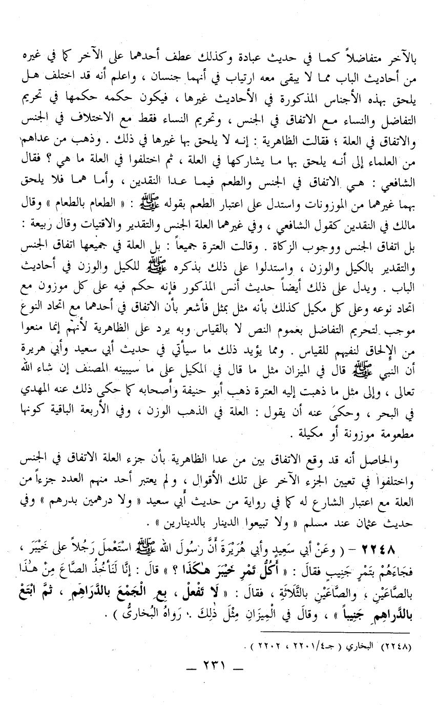 وَالْحَاصِلُ أَنَّهُ قَدْ وَقَعَ الِاتِّفَاقُ بَيْنَ مَنْ عَدَا الظَّاهِرِيَّةَ بِأَنَّ جُزْءَ الْعِلَّةِ الِاتِّفَاقُ فِي الْجِنْسِ وَاخْتَلَفُوا فِي تَعْيِينِ الْجُزْءِ الْآخَرِ عَلَى تِلْكَ الْأَقْوَالِ وَلَمْ يَعْتَبِرْ أَحَدٌ مِنْهُمْ الْعَدَدَ جُزْءًا مِنْ الْعِلَّةِ مَعَ اعْتِبَارِ الشَّارِعِ لَهُ كَمَا فِي رِوَايَةٍ مِنْ حَدِيثِ أَبِي سَعِيدٍ «وَلَا دِرْهَمَيْنِ بِدِرْهَمٍ» وَفِي حَدِيثِ عُثْمَانَ عِنْدَ مُسْلِمٍ «وَلَا تَبِيعُوا الدِّينَارَ بِالدِّينَارَيْنِ» .