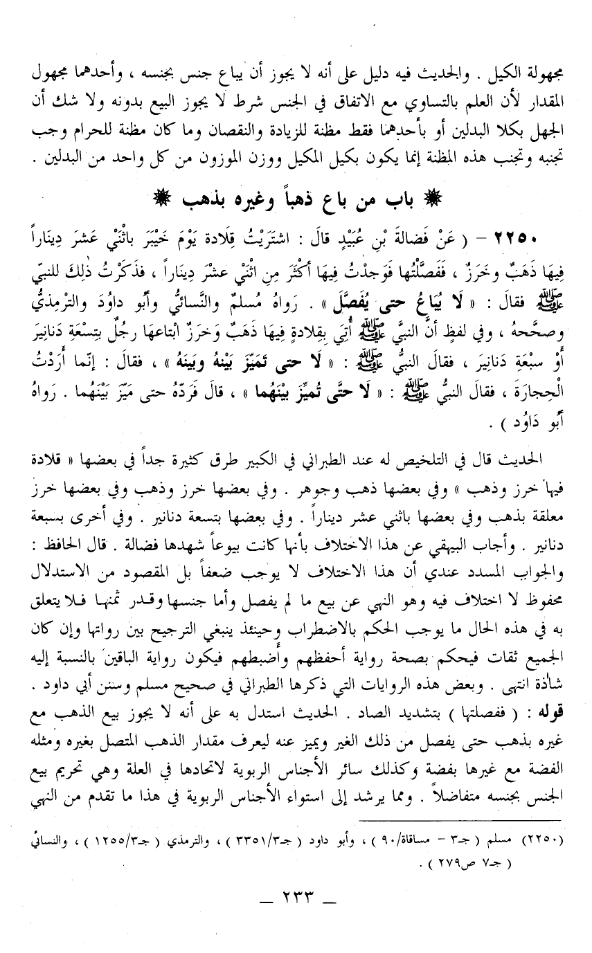 2250 - (عَنْ فَضَالَةَ بْنِ عُبَيْدٍ قَالَ: «اشْتَرَيْتُ قِلَادَةً يَوْمَ خَيْبَرَ بِاثْنَيْ عَشَرَ دِينَارًا فِيهَا ذَهَبٌ وَخَرَزٌ، فَفَصَّلْتُهَا فَوَجَدْتُ فِيهَا أَكْثَرَ مِنْ اثْنَيْ عَشَرَ دِينَارًا، فَذَكَرْتُ ذَلِكَ لِلنَّبِيِّ - صَلَّى اللَّهُ عَلَيْهِ وَسَلَّمَ - فَقَالَ: لَا يُبَاعُ حَتَّى يُفَصَّلَ» . رَوَاهُ مُسْلِمٌ وَالنَّسَائِيُّ وَأَبُو دَاوُد وَالتِّرْمِذِيُّ وَصَحَّحَهُ، وَفِي لَفْظٍ «أَنَّ النَّبِيَّ - صَلَّى اللَّهُ عَلَيْهِ وَسَلَّمَ - أُتِيَ بِقِلَادَةٍ فِيهَا ذَهَبٌ وَخَرَزٌ ابْتَاعَهَا رَجُلٌ بِتِسْعَةِ دَنَانِيرَ أَوْ سَبْعَةِ دَنَانِيرَ، فَقَالَ النَّبِيُّ - صَلَّى اللَّهُ عَلَيْهِ وَسَلَّمَ - لَا حَتَّى تُمَيِّزَ بَيْنَهُ وَبَيْنَهُ، فَقَالَ: إنَّمَا أَرَدْتُ الْحِجَارَةَ، فَقَالَ النَّبِيُّ - صَلَّى اللَّهُ عَلَيْهِ وَسَلَّمَ - لَا حَتَّى تُمَيِّزَ بَيْنَهُمَا، قَالَ فَرَدَّهُ حَتَّى مَيَّزَ بَيْنَهُمَا.» رَوَاهُ أَبُو دَاوُد) .