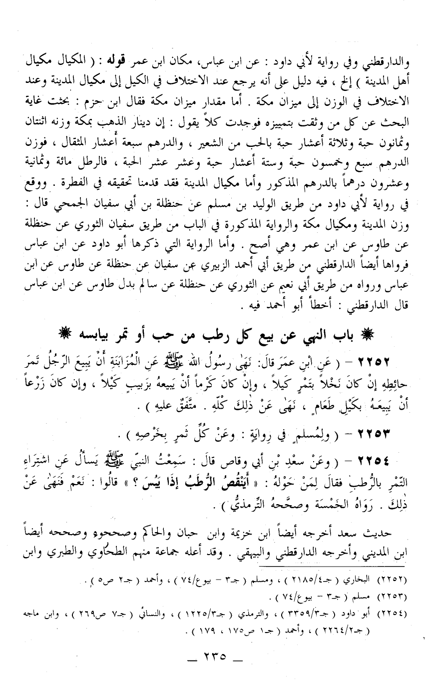 2254 - (وَعَنْ سَعْدِ بْنِ أَبِي وَقَّاصٍ قَالَ: «سَمِعْتُ النَّبِيَّ - صَلَّى اللَّهُ عَلَيْهِ وَسَلَّمَ - يُسْأَلُ عَنْ اشْتِرَاءِ التَّمْرِ بِالرُّطَبِ فَقَالَ لِمَنْ حَوْلَهُ: أَيَنْقُصُ الرُّطَبُ إذَا يَبِسَ؟ قَالُوا: نَعَمْ فَنَهَى عَنْ ذَلِكَ.» رَوَاهُ الْخَمْسَةُ وَصَحَّحَهُ التِّرْمِذِيُّ) .