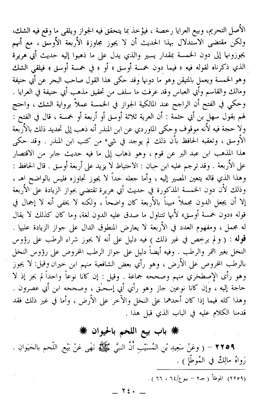 2259 - (وَعَنْ سَعِيدِ بْنِ الْمُسَيِّبِ أَنَّ النَّبِيَّ - صَلَّى اللَّهُ عَلَيْهِ وَسَلَّمَ - «نَهَى عَنْ بَيْعِ اللَّحْمِ بِالْحَيَوَانِ» رَوَاهُ مَالِكٌ فِي الْمُوَطَّأِ)