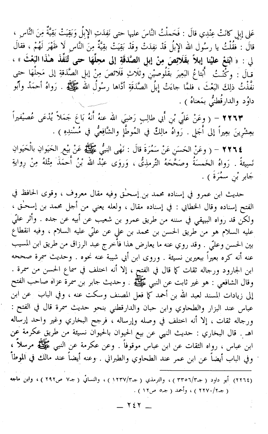 2264 - (وَعَنْ الْحَسَنِ عَنْ سَمُرَةَ قَالَ: «نَهَى النَّبِيُّ - صَلَّى اللَّهُ عَلَيْهِ وَسَلَّمَ - عَنْ بَيْعِ الْحَيَوَانِ بِالْحَيَوَانِ نَسِيئَةً.» رَوَاهُ الْخَمْسَةُ وَصَحَّحَهُ التِّرْمِذِيُّ، وَرَوَى عَبْدُ اللَّهِ بْنُ أَحْمَدَ مِثْلَهُ مِنْ رِوَايَةِ جَابِرِ بْنِ سَمُرَةَ)