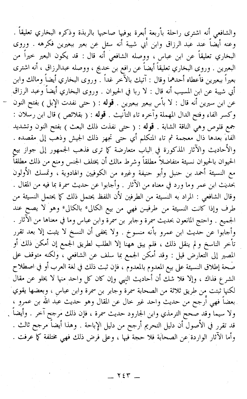 ـــــــــــــــــــــــــــــQوَالشَّافِعِيِّ أَنَّهُ اشْتَرَى رَاحِلَةً بِأَرْبَعَةِ أَبْعِرَةٍ يُوفِيهَا صَاحِبَهَا بِالرَّبَذَةِ وَذَكَرَهُ الْبُخَارِيُّ تَعْلِيقًا، وَعَنْهُ أَيْضًا عِنْدَ عَبْدِ الرَّزَّاقِ وَابْنِ أَبِي شَيْبَةَ أَنَّهُ سُئِلَ عَنْ بَعِيرٍ بِبَعِيرَيْنِ فَكَرِهَهُ، وَرَوَى الْبُخَارِيُّ تَعْلِيقًا عَنْ ابْنِ عَبَّاسٍ، وَوَصَلَهُ الشَّافِعِيُّ أَنَّهُ قَالَ: قَدْ يَكُونُ الْبَعِيرُ خَيْرًا مِنْ الْبَعِيرَيْنِ، وَرَوَى الْبُخَارِيُّ تَعْلِيقًا أَيْضًا عَنْ رَافِعِ بْنِ خَدِيجٍ، وَوَصَلَهُ عَبْدُ الرَّزَّاقِ، أَنَّهُ اشْتَرَى بَعِيرًا بِبَعِيرَيْنِ فَأَعْطَاهُ أَحَدَهُمَا وَقَالَ: آتِيكَ بِالْآخَرِ غَدًا، وَرَوَى الْبُخَارِيُّ أَيْضًا وَمَالِكٌ وَابْنُ أَبِي شَيْبَةَ عَنْ ابْنِ الْمُسَيِّبِ أَنَّهُ قَالَ: لَا رِبَا فِي الْحَيَوَانِ، وَرَوَى الْبُخَارِيُّ أَيْضًا وَعَبْدُ الرَّزَّاقِ عَنْ ابْنِ سِيرِينَ أَنَّهُ قَالَ: لَا بَأْسَ بِبَعِيرٍ بِبَعِيرَيْنِ.