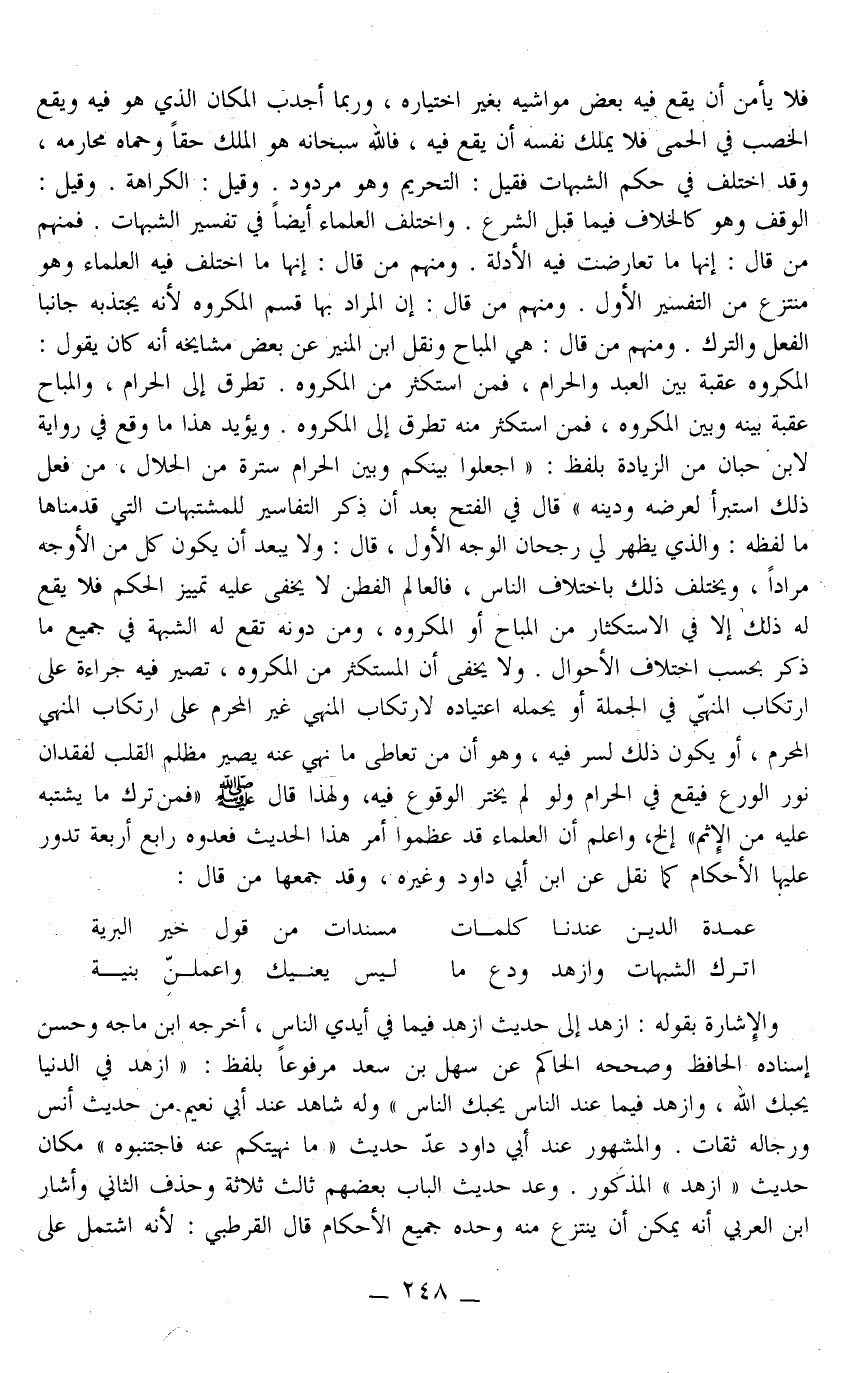 وَيُؤَيِّدُ هَذَا مَا وَقَعَ فِي رِوَايَةٍ لِابْنِ حِبَّانَ مِنْ الزِّيَادَةِ بِلَفْظِ: «اجْعَلُوا بَيْنَكُمْ وَبَيْنَ الْحَرَامِ سُتْرَةً مِنْ الْحَلَالِ، مَنْ فَعَلَ ذَلِكَ اسْتَبْرَأَ لِعِرْضِهِ وَدِينِهِ» قَالَ فِي الْفَتْحِ بَعْدَ أَنْ ذَكَرَ التَّفَاسِيرَ لِلْمُشْتَبِهَاتِ الَّتِي قَدَّمْنَاهَا مَا لَفْظُهُ: وَاَلَّذِي يَظْهَرُ لِي رُجْحَانُ الْوَجْهِ الْأَوَّلِ، قَالَ: وَلَا يَبْعُدُ أَنْ يَكُونَ كُلٌّ مِنْ الْأَوْجُهِ مُرَادًا، وَيَخْتَلِفُ ذَلِكَ بِاخْتِلَافِ النَّاسِ، فَالْعَالِمُ الْفَطِنُ لَا يَخْفَى عَلَيْهِ تَمْيِيزُ الْحُكْمِ فَلَا يَقَعُ لَهُ ذَلِكَ إلَّا فِي الِاسْتِكْثَارِ مِنْ الْمُبَاحِ أَوْ الْمَكْرُوهِ، وَمَنْ دُونَهُ تَقَعُ لَهُ الشُّبْهَةُ فِي جَمِيعِ مَا ذُكِرَ بِحَسَبِ اخْتِلَافِ الْأَحْوَالِ