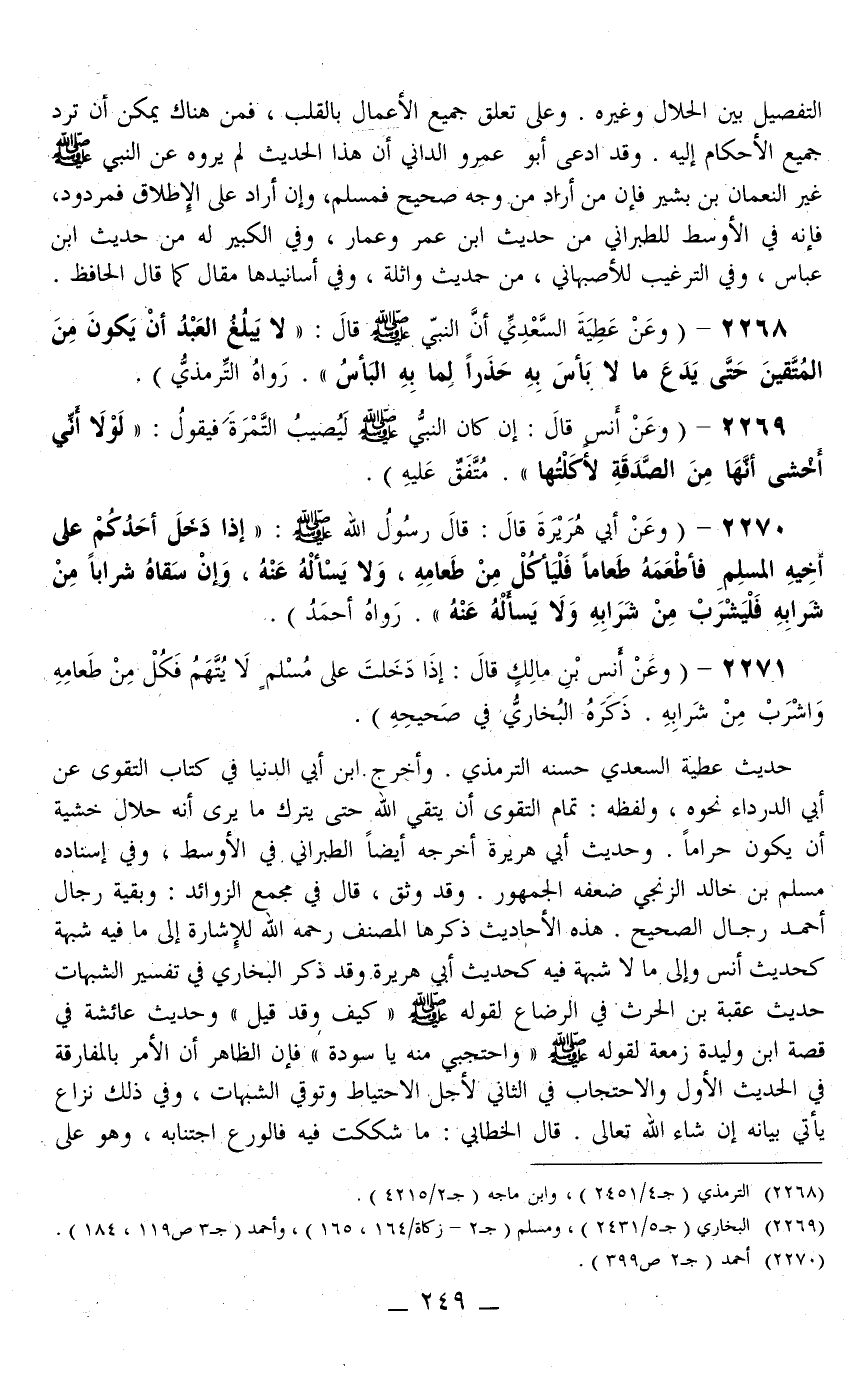 حَدِيثُ عَطِيَّةَ السَّعْدِيِّ حَسَّنَهُ التِّرْمِذِيُّ وَأَخْرَجَ ابْنُ أَبِي الدُّنْيَا فِي كِتَابِ التَّقْوَى عَنْ أَبِي الدَّرْدَاءِ نَحْوَهُ، وَلَفْظُهُ: «تَمَامُ التَّقْوَى أَنْ يَتَّقِيَ اللَّهَ حَتَّى يَتْرُكَ مَا يَرَى أَنَّهُ حَلَالٌ خَشْيَةَ أَنْ يَكُونَ حَرَامًا» وَحَدِيثُ أَبِي هُرَيْرَةَ أَخْرَجَهُ أَيْضًا الطَّبَرَانِيُّ فِي الْأَوْسَطِ، وَفِي إسْنَادِهِ مُسْلِمُ بْنُ خَالِدٍ الزِّنْجِيُّ ضَعَّفَهُ الْجُمْهُورُ وَقَدْ وُثِّقَ، قَالَ فِي مَجْمَعِ الزَّوَائِدِ: وَبَقِيَّةُ رِجَالِ أَحْمَدَ رِجَالُ الصَّحِيحِ هَذِهِ الْأَحَادِيثُ ذَكَرَهَا الْمُصَنِّفُ - رَحِمَهُ اللَّهُ - لِلْإِشَارَةِ إلَى مَا فِيهِ شُبْهَةٌ كَحَدِيثِ أَنَسٍ وَإِلَى مَا لَا شُبْهَةَ فِيهِ كَحَدِيثِ أَبِي هُرَيْرَةَ وَقَدْ ذَكَرَ الْبُخَارِيُّ فِي تَفْسِيرِ الشُّبُهَاتِ حَدِيثَ عُقْبَةَ بْنِ الْحَارِثِ فِي الرَّضَاعِ لِقَوْلِهِ - صَلَّى اللَّهُ عَلَيْهِ وَسَلَّمَ - " كَيْفَ وَقَدْ قِيلَ " وَحَدِيثُ عَائِشَةَ فِي قِصَّةِ ابْنِ وَلِيدَةِ زَمْعَةَ لِقَوْلِهِ - صَلَّى اللَّهُ عَلَيْهِ وَسَلَّمَ - «وَاحْتَجِبِي مِنْهُ يَا سَوْدَةُ» فَإِنَّ الظَّاهِرَ أَنَّ الْأَمْرَ بِالْمُفَارَقَةِ فِي الْحَدِيثِ الْأَوَّلِ، وَالِاحْتِجَابِ فِي الثَّانِي لِأَجْلِ الِاحْتِيَاطِ وَتَوَقِّي الشُّبُهَاتِ، وَفِي ذَلِكَ نِزَاعٌ يَأْتِي بَيَانُهُ إنْ شَاءَ اللَّهُ تَعَالَى