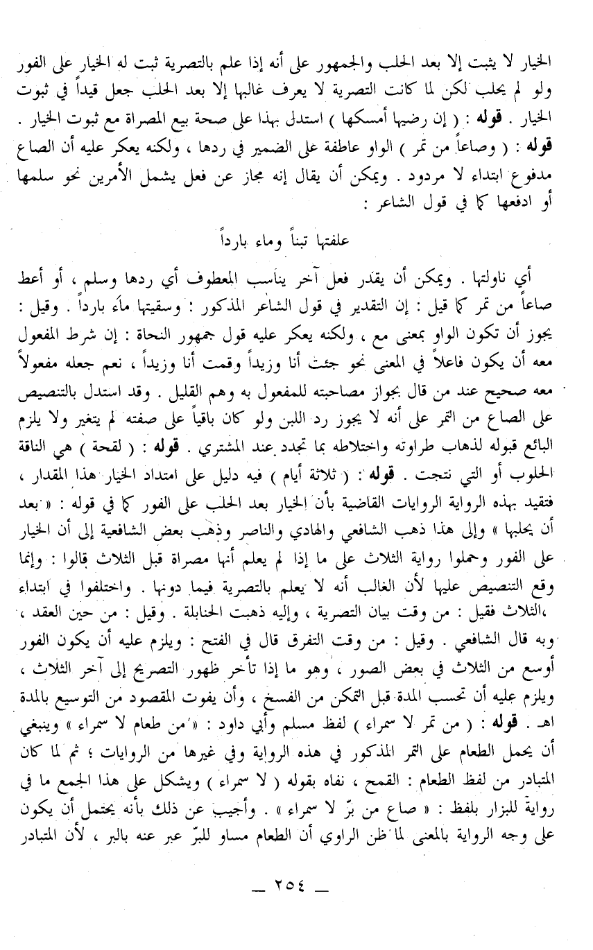 ـــــــــــــــــــــــــــــQالْخِيَارَ لَا يَثْبُتُ إلَّا بَعْدَ الْحَلْبِ وَالْجُمْهُورُ عَلَى أَنَّهُ إذَا عَلِمَ بِالتَّصْرِيَةِ ثَبَتَ لَهُ الْخِيَارُ عَلَى الْفَوْرِ وَلَوْ لَمْ يَحْلِبْ لَكِنْ لَمَّا كَانَتْ التَّصْرِيَةُ لَا يُعْرَفُ غَالِبُهَا إلَّا بَعْدَ الْحَلْبِ جُعِلَ قَيْدًا فِي ثُبُوتِ الْخِيَارِ قَوْلُهُ: (إنْ رَضِيَهَا أَمْسَكَهَا) اُسْتُدِلَّ بِهَذَا عَلَى صِحَّةِ بَيْعِ الْمُصَرَّاةِ مَعَ ثُبُوتِ الْخِيَارِ قَوْلُهُ: (وَصَاعًا مِنْ تَمْرٍ) الْوَاوُ عَاطِفَةٌ عَلَى الضَّمِيرِ فِي رَدِّهَا، وَلَكِنَّهُ يُعَكِّرُ عَلَيْهِ أَنَّ الصَّاعَ مَدْفُوعٌ ابْتِدَاءً لَا مَرْدُودٌ وَيُمْكِنُ أَنْ يُقَالَ إنَّهُ مَجَازٌ عَنْ فِعْلٍ يَشْمَلُ الْأَمْرَيْنِ نَحْوَ سَلِّمْهَا أَوْ ادْفَعْهَا كَمَا فِي قَوْلِ الشَّاعِرِ: