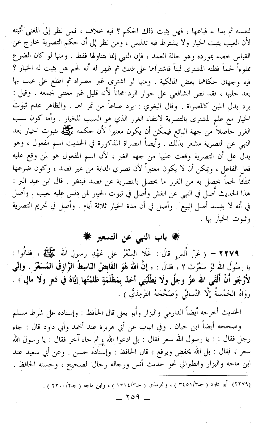 2279 - (عَنْ أَنَسٍ قَالَ: غَلَا السِّعْرُ عَلَى عَهْدِ رَسُولِ اللَّهِ - صَلَّى اللَّهُ عَلَيْهِ وَسَلَّمَ - فَقَالُوا: يَا رَسُولَ اللَّهِ لَوْ سَعَّرْتَ؟ ، فَقَالَ: «إنَّ اللَّهَ هُوَ الْقَابِضُ الْبَاسِطُ الرَّازِقُ الْمُسَعِّرُ، وَإِنِّي لَأَرْجُو أَنْ أَلْقَى اللَّهَ عَزَّ وَجَلَّ وَلَا يَطْلُبُنِي أَحَدٌ بِمَظْلِمَةٍ ظَلَمْتُهَا إيَّاهُ فِي دَمٍ وَلَا مَالٍ» رَوَاهُ الْخَمْسَةُ إلَّا النَّسَائِيّ وَصَحَّحَهُ التِّرْمِذِيُّ)