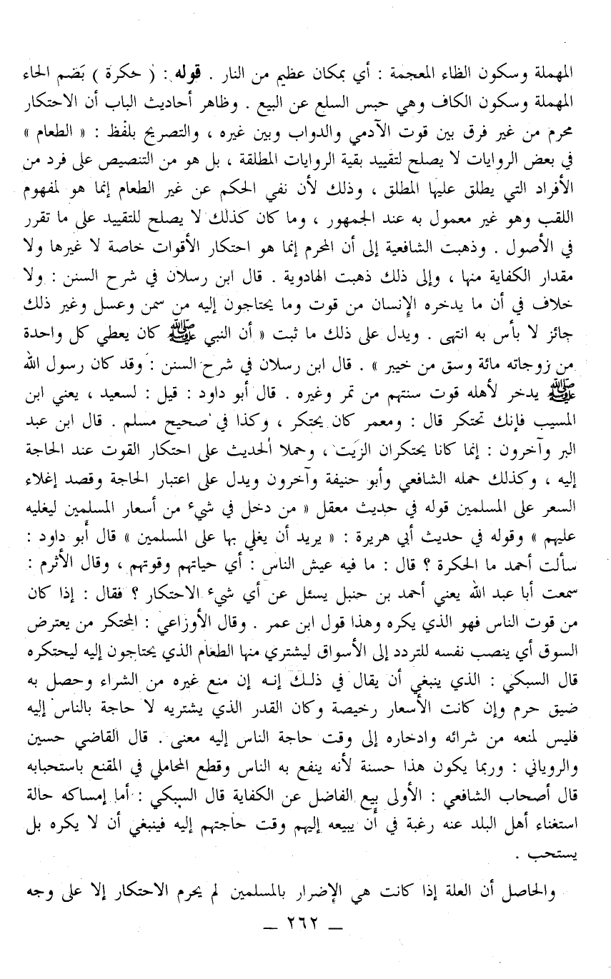 وَكَذَا فِي صَحِيحِ مُسْلِمٍ قَالَ ابْنُ عَبْدِ الْبَرِّ وَآخَرُونَ: إنَّمَا كَانَا يَحْتَكِرَانِ الزَّيْتَ، وَحَمَلَا الْحَدِيثَ عَلَى احْتِكَارِ الْقُوتِ عِنْدَ الْحَاجَةِ إلَيْهِ، وَكَذَلِكَ حَمَلَهُ الشَّافِعِيُّ وَأَبُو حَنِيفَةَ وَآخَرُونَ وَيَدُلُّ عَلَى اعْتِبَارِ الْحَاجَةِ وَقَصْدِ إغْلَاءِ السِّعْرِ عَلَى الْمُسْلِمِينَ قَوْلُهُ فِي حَدِيثِ مَعْقِلٍ «مَنْ دَخَلَ فِي شَيْءٍ مِنْ أَسْعَارِ الْمُسْلِمِينَ لِيُغْلِيَهُ عَلَيْهِمْ» ، وَقَوْلُهُ فِي حَدِيثِ أَبِي هُرَيْرَةَ: «يُرِيدُ أَنْ يُغْلِيَ بِهَا عَلَى الْمُسْلِمِينَ» قَالَ أَبُو دَاوُد: سَأَلْتُ أَحْمَدَ مَا الْحُكْرَةُ؟ قَالَ: مَا فِيهِ عَيْشُ النَّاسِ: أَيْ: حَيَاتُهُمْ وَقُوتُهُمْ، وَقَالَ الْأَثْرَمُ: سَمِعْتُ أَبَا عَبْدِ اللَّهِ يَعْنِي: أَحْمَدَ بْنَ حَنْبَلٍ يُسْأَلُ عَنْ أَيِّ شَيْءٍ الِاحْتِكَارُ؟ فَقَالَ: إذَا كَانَ مِنْ قُوتِ النَّاسِ فَهُوَ الَّذِي يُكْرَهُ وَهَذَا قَوْلُ ابْنِ عُمَرَ وَقَالَ الْأَوْزَاعِيُّ: الْمُحْتَكِرُ مَنْ يَعْتَرِضُ السُّوقَ أَيْ: يَنْصِبُ نَفْسَهُ لِلتَّرَدُّدِ إلَى الْأَسْوَاقِ لِيَشْتَرِيَ مِنْهَا الطَّعَامَ الَّذِي يَحْتَاجُونَ إلَيْهِ لِيَحْتَكِرَهُ قَالَ السُّبْكِيُّ: الَّذِي يَنْبَغِي أَنْ يُقَالَ فِي ذَلِكَ أَنَّهُ إنْ مَنَعَ غَيْرَهُ مِنْ الشِّرَاءِ وَحَصَلَ بِهِ ضِيقٌ حُرِّمَ وَإِنْ كَانَتْ الْأَسْعَارُ رَخِيصَةً وَكَانَ الْقَدْرُ الَّذِي يَشْتَرِيهِ لَا حَاجَةَ بِالنَّاسِ إلَيْهِ فَلَيْسَ لِمَنْعِهِ مِنْ شِرَائِهِ وَادِّخَارِهِ إلَى وَقْتِ حَاجَةِ النَّاسِ إلَيْهِ مَعْنًى قَالَ الْقَاضِي حُسَيْنٌ وَالرُّويَانِيُّ: وَرُبَّمَا يَكُونُ هَذَا حَسَنَةً؛ لِأَنَّهُ يَنْفَعُ بِهِ النَّاسَ وَقَطَعَ الْمَحَامِلِيُّ فِي الْمُقْنِعِ بِاسْتِحْبَابِهِ قَالَ أَصْحَابُ الشَّافِعِيِّ: الْأَوْلَى بَيْعُ الْفَاضِلِ عَنْ الْكِفَايَةِ قَالَ السُّبْكِيُّ: أَمَّا إمْسَاكُهُ حَالَةَ اسْتِغْنَاءِ أَهْلِ الْبَلَدِ عَنْهُ رَغْبَةً فِي أَنْ يَبِيعَهُ إلَيْهِمْ وَقْتَ حَاجَتِهِمْ إلَيْهِ فَيَنْبَغِي أَنْ لَا يُكْرَهَ بَلْ يُسْتَحَبُّ وَالْحَاصِلُ أَنَّ الْعِلَّةَ إذَا كَانَتْ هِيَ الْإِضْرَارَ بِالْمُسْلِمِينَ لَمْ يَحْرُمْ الِاحْتِكَارُ إلَّا عَلَى وَجْهٍ