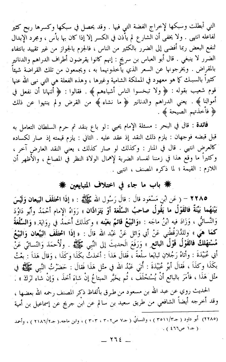 2285 - (عَنْ ابْنِ مَسْعُودٍ قَالَ: قَالَ رَسُولُ اللَّهِ - صَلَّى اللَّهُ عَلَيْهِ وَسَلَّمَ -: «إذَا اخْتَلَفَ الْبَيِّعَانِ وَلَيْسَ بَيْنَهُمَا بَيِّنَةٌ فَالْقَوْلُ مَا يَقُولُ صَاحِبُ السِّلْعَةِ أَوْ يَتَرَادَّانِ» رَوَاهُ الْإِمَامُ أَحْمَدُ وَأَبُو دَاوُد وَالنَّسَائِيُّ، وَزَادَ فِيهِ ابْنُ مَاجَهْ: «وَالْبَيْعُ قَائِمٌ بِعَيْنِهِ» وَكَذَلِكَ أَحْمَدُ فِي رِوَايَةٍ «وَالسِّلْعَةُ كَمَا هِيَ» وَلِلدَّارَقُطْنِيِّ عَنْ أَبِي وَائِلٍ عَنْ عَبْدِ اللَّهِ قَالَ: «إذَا اخْتَلَفَ الْبَيِّعَانِ وَالْبَيْعُ مُسْتَهْلَكٌ فَالْقَوْلُ قَوْلُ الْبَائِعِ» وَرَفَعَ الْحَدِيثَ إلَى النَّبِيِّ - صَلَّى اللَّهُ عَلَيْهِ وَسَلَّمَ - وَلِأَحْمَدَ وَالنَّسَائِيُّ عَنْ أَبِي عُبَيْدَةَ: «وَأَتَاهُ رَجُلَانِ تَبَايَعَا سِلْعَةً، فَقَالَ هَذَا: أَخَذْت بِكَذَا وَكَذَا، وَقَالَ هَذَا: بِعْت بِكَذَا وَكَذَا، فَقَالَ أَبُو عُبَيْدَةَ: أُتِيَ عَبْدُ اللَّهِ فِي مِثْلِ هَذَا فَقَالَ: حَضَرْتُ النَّبِيَّ - صَلَّى اللَّهُ عَلَيْهِ وَسَلَّمَ - فِي مِثْلِ هَذَا، فَأَمَرَ بِالْبَائِعِ أَنْ يُسْتَحْلَفَ، ثُمَّ يُخَيَّرَ الْمُبْتَاعُ إنْ شَاءَ أَخَذَ، وَإِنْ شَاءَ تَرَكَ»
