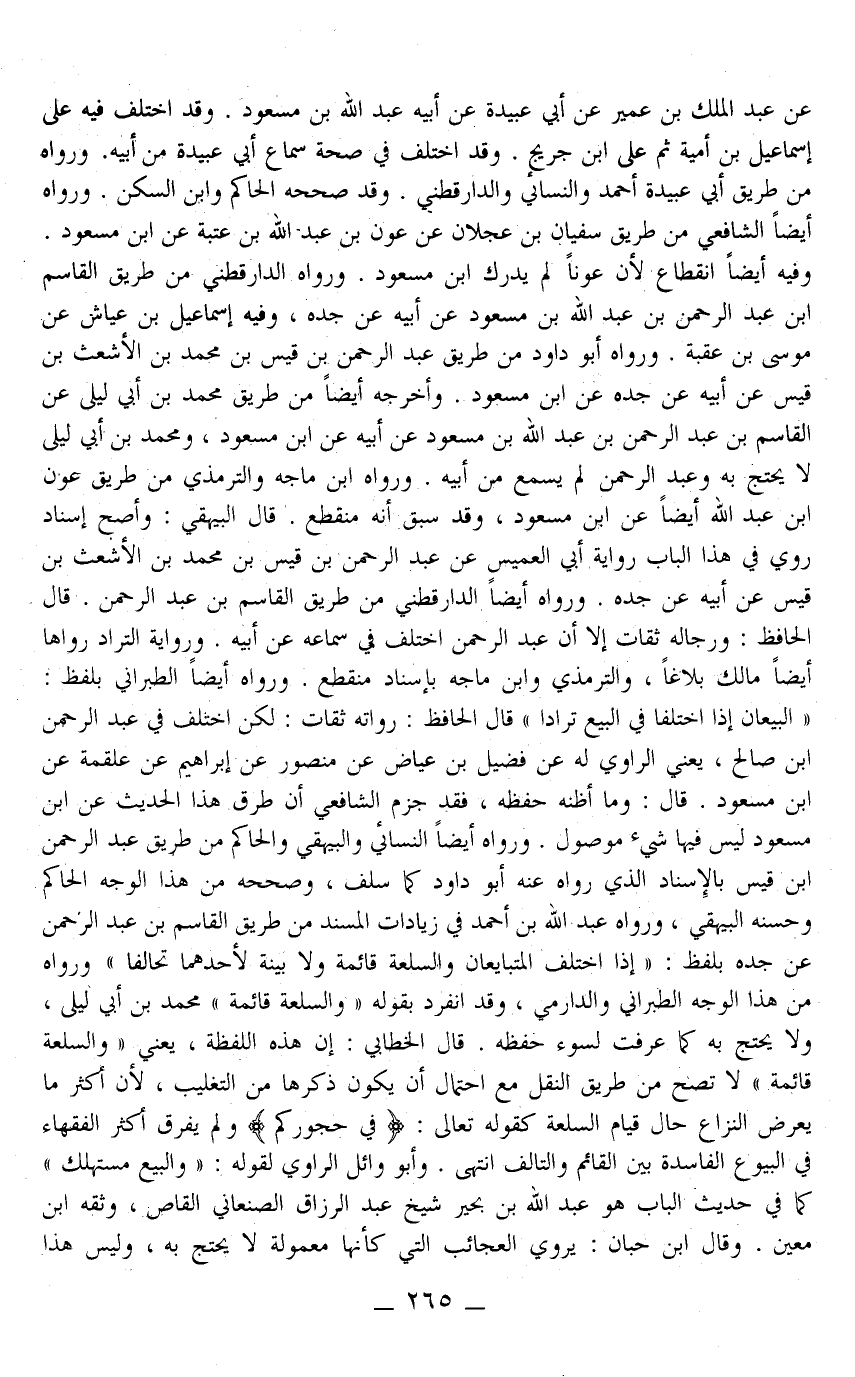 قَالَ الْبَيْهَقِيُّ: وَأَصَحُّ إسْنَادٍ رُوِيَ فِي هَذَا الْبَابِ رِوَايَةُ أَبِي الْعُمَيْسِ عَنْ عَبْدِ الرَّحْمَنِ بْنِ قَيْسِ بْنِ مُحَمَّدِ بْنِ الْأَشْعَثِ بْنِ قَيْسٍ عَنْ أَبِيهِ عَنْ جَدِّهِ وَرَوَاهُ أَيْضًا الدَّارَقُطْنِيّ مِنْ طَرِيقِ الْقَاسِمِ بْنِ عَبْدِ الرَّحْمَنِ قَالَ الْحَافِظُ: وَرِجَالُهُ ثِقَاتٌ إلَّا أَنَّ عَبْدَ الرَّحْمَنِ اُخْتُلِفَ فِي سَمَاعِهِ مِنْ أَبِيهِ وَرِوَايَةُ التَّرَادِّ رَوَاهَا أَيْضًا مَالِكٌ بَلَاغًا، وَالتِّرْمِذِيُّ وَابْنُ مَاجَهْ بِإِسْنَادٍ مُنْقَطِعٍ وَرَوَاهُ أَيْضًا الطَّبَرَانِيُّ بِلَفْظِ: «الْبَيِّعَانِ إذَا اخْتَلَفَا فِي الْبَيْعِ تَرَادَّا» قَالَ الْحَافِظُ: رُوَاتُهُ ثِقَاتٌ: لَكِنْ اُخْتُلِفَ فِي عَبْدِ الرَّحْمَنِ بْنِ صَالِحٍ، يَعْنِي: الرَّاوِي لَهُ عَنْ فُضَيْلٍ بْنِ عِيَاضٍ عَنْ مَنْصُورٍ عَنْ إبْرَاهِيمَ عَنْ عَلْقَمَةَ عَنْ ابْنِ مَسْعُودٍ قَالَ: وَمَا أَظُنُّهُ حَفِظَهُ، فَقَدْ جَزَمَ الشَّافِعِيُّ أَنَّ طُرُقَ هَذَا الْحَدِيثِ عَنْ ابْنِ مَسْعُودٍ لَيْسَ فِيهَا شَيْءٌ مَوْصُولٌ وَرَوَاهُ أَيْضًا النَّسَائِيّ وَالْبَيْهَقِيُّ وَالْحَاكِمُ مِنْ طَرِيقِ عَبْدِ الرَّحْمَنِ بْنِ قَيْسٍ بِالْإِسْنَادِ الَّذِي رَوَاهُ عَنْهُ أَبُو دَاوُد كَمَا سَلَفَ، وَصَحَّحَهُ مِنْ هَذَا الْوَجْهِ الْحَاكِمُ وَحَسَّنَهُ الْبَيْهَقِيُّ.