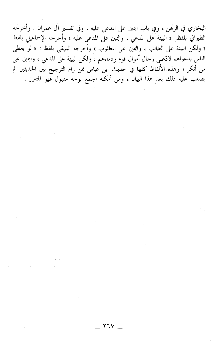 ـــــــــــــــــــــــــــــQالْبُخَارِيِّ فِي الرَّهْنِ، وَفِي بَابِ الْيَمِينِ عَلَى الْمُدَّعَى عَلَيْهِ، وَفِي تَفْسِيرِ آلِ عِمْرَانَ وَأَخْرَجَهُ الطَّبَرَانِيُّ بِلَفْظِ «الْبَيِّنَةُ عَلَى الْمُدَّعِي، وَالْيَمِينُ عَلَى الْمُدَّعَى عَلَيْهِ» وَأَخْرَجَهُ الْإِسْمَاعِيلِيُّ بِلَفْظِ «وَلَكِنَّ الْبَيِّنَةَ عَلَى الطَّالِبِ، وَالْيَمِينَ عَلَى الْمَطْلُوبِ» وَأَخْرَجَهُ الْبَيْهَقِيُّ بِلَفْظِ: «لَوْ يُعْطَى النَّاسُ بِدَعْوَاهُمْ لَادَّعَى رِجَالٌ أَمْوَالَ قَوْمٍ وَدِمَاءَهُمْ، وَلَكِنَّ الْبَيِّنَةَ عَلَى الْمُدَّعِي، وَالْيَمِينَ عَلَى مَنْ أَنْكَرَ» وَهَذِهِ الْأَلْفَاظُ كُلُّهَا فِي حَدِيثِ ابْنِ عَبَّاسٍ مِمَّنْ رَامَ التَّرْجِيحَ بَيْنَ الْحَدِيثَيْنِ لَمْ يَصْعُبْ عَلَيْهِ ذَلِكَ بَعْدَ هَذَا الْبَيَانِ، وَمَنْ أَمْكَنَهُ الْجَمْعُ بِوَجْهٍ مَقْبُولٍ فَهُوَ الْمُتَعَيِّنُ