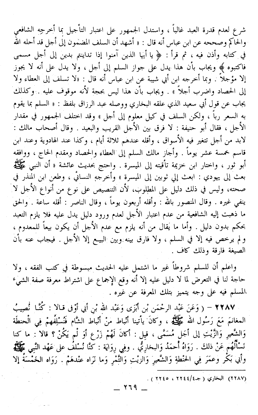 2287 - (وَعَنْ عَبْدِ الرَّحْمَنِ بْنِ أَبْزَى وَعَبْدِ اللَّهِ بْنِ أَبِي أَوْفَى قَالَا: «كُنَّا نُصِيبُ الْمَغَانِمَ مَعَ رَسُولِ اللَّهِ - صَلَّى اللَّهُ عَلَيْهِ وَسَلَّمَ - وَكَانَ يَأْتِينَا أَنْبَاطٌ مِنْ أَنْبَاطِ الشَّامِ فَنُسْلِفُهُمْ فِي الْحِنْطَةِ وَالشَّعِيرِ وَالزَّيْتِ إلَى أَجَلٍ مُسَمًّى، قِيلَ: أَكَانَ لَهُمْ زَرْعٌ أَوْ لَمْ يَكُنْ؟ قَالَا: مَا كُنَّا نَسْأَلُهُمْ عَنْ ذَلِكَ» رَوَاهُ أَحْمَدُ وَالْبُخَارِيُّ وَفِي رِوَايَةٍ: «كُنَّا نُسْلِفُ عَلَى عَهْدِ النَّبِيِّ - صَلَّى اللَّهُ عَلَيْهِ وَسَلَّمَ - وَأَبِي بَكْرٍ وَعُمَرَ فِي الْحِنْطَةِ وَالشَّعِيرِ وَالزَّيْتِ وَالتَّمْرِ وَمَا نَرَاهُ عِنْدَهُمْ» رَوَاهُ الْخَمْسَةُ إلَّا