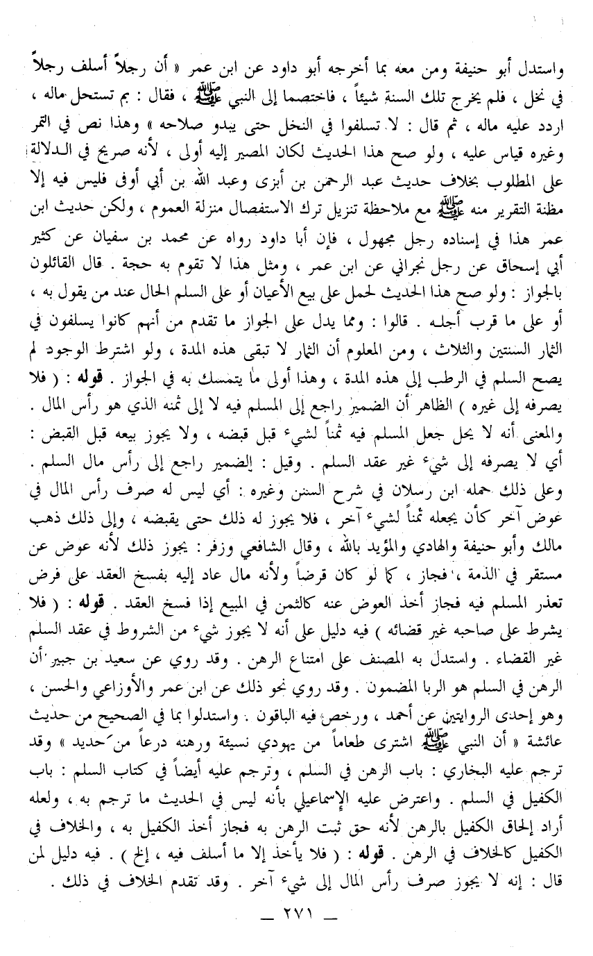 ـــــــــــــــــــــــــــــQوَاسْتَدَلَّ أَبُو حَنِيفَةَ وَمَنْ مَعَهُ بِمَا أَخْرَجَهُ أَبُو دَاوُد عَنْ ابْنِ عُمَرَ «أَنَّ رَجُلًا أَسْلَفَ رَجُلًا فِي نَخْلٍ، فَلَمْ يُخْرِجْ تِلْكَ السَّنَةَ شَيْئًا، فَاخْتَصَمَا إلَى النَّبِيِّ - صَلَّى اللَّهُ عَلَيْهِ وَسَلَّمَ - فَقَالَ: بِمَ تَسْتَحِلُّ مَالَهُ، اُرْدُدْ عَلَيْهِ مَالَهُ، ثُمَّ قَالَ: لَا تُسْلِفُوا فِي النَّخْلِ حَتَّى يَبْدُوَ صَلَاحُهُ» وَهَذَا نَصٌّ فِي التَّمْرِ، وَغَيْرُهُ قِيَاسٌ عَلَيْهِ، وَلَوْ صَحَّ هَذَا الْحَدِيثُ لَكَانَ الْمَصِيرُ إلَيْهِ أَوْلَى،؛ لِأَنَّهُ صَرِيحٌ فِي الدَّلَالَةِ عَلَى الْمَطْلُوبِ بِخِلَافِ حَدِيثِ عَبْدِ الرَّحْمَنِ بْنِ أَبْزَى وَعَبْدِ اللَّهِ بْنِ أَبِي أَوْفَى فَلَيْسَ فِيهِ إلَّا مَظِنَّةُ التَّقْرِيرِ مِنْهُ - صَلَّى اللَّهُ عَلَيْهِ وَسَلَّمَ - مَعَ مُلَاحَظَةِ تَنْزِيلِ تَرْكِ الِاسْتِفْصَالِ مَنْزِلَةَ الْعُمُومِ، وَلَكِنَّ حَدِيثَ ابْنَ عُمَرَ هَذَا فِي إسْنَادِهِ رَجُلٌ مَجْهُولٌ، فَإِنَّ أَبَا دَاوُد رَوَاهُ عَنْ مُحَمَّدِ بْنِ كَثِيرٍ عَنْ سُفْيَانَ عَنْ أَبِي إِسْحَاقَ عَنْ رَجُلٍ نَجْرَانِيٍّ عَنْ ابْنِ عُمَرَ، وَمِثْلُ هَذَا لَا تَقُومُ بِهِ حُجَّةٌ قَالَ الْقَائِلُونَ بِالْجَوَازِ: وَلَوْ صَحَّ هَذَا الْحَدِيثُ لَحُمِلَ عَلَى بَيْعِ الْأَعْيَانِ أَوْ عَلَى السَّلَمِ الْحَالِّ عِنْدَ مَنْ يَقُولُ بِهِ، أَوْ عَلَى مَا قَرُبَ أَجَلُهُ قَالُوا: وَمِمَّا يَدُلُّ عَلَى الْجَوَازِ مَا تَقَدَّمَ مِنْ أَنَّهُمْ كَانُوا يُسْلِفُونَ فِي الثِّمَارِ السَّنَتَيْنِ وَالثَّلَاثَ، وَمِنْ الْمَعْلُومِ أَنَّ الثِّمَارَ لَا تَبْقَى هَذِهِ الْمُدَّةَ، وَلَوْ اُشْتُرِطَ الْوُجُودُ لَمْ يَصِحَّ السَّلَمُ فِي الرُّطَبِ إلَى هَذِهِ الْمُدَّةِ، وَهَذَا أَوْلَى مَا يُتَمَسَّكُ بِهِ فِي الْجَوَازِ