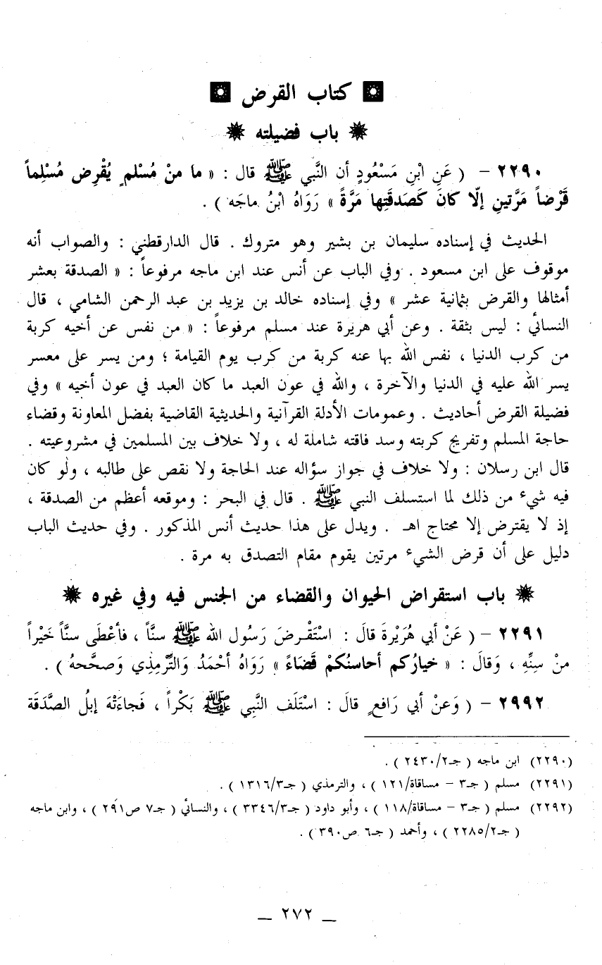 عَنْ ابْنِ مَسْعُودٍ أَنَّ النَّبِيَّ - صَلَّى اللَّهُ عَلَيْهِ وَسَلَّمَ - قَالَ: «مَا مِنْ مُسْلِمٍ يُقْرِضُ مُسْلِمًا قَرْضًا مَرَّتَيْنِ إلَّا كَانَ كَصَدَقَتِهَا مَرَّةً» ، رَوَاهُ ابْنُ مَاجَهْ) الْحَدِيثُ فِي إسْنَادِهِ سُلَيْمَانُ بْنُ بَشِيرٍ وَهُوَ مَتْرُوكٌ قَالَ الدَّارَقُطْنِيّ: وَالصَّوَابُ أَنَّهُ مَوْقُوفٌ عَلَى ابْنِ مَسْعُودٍ وَفِي الْبَابِ عَنْ أَنَسٍ عِنْدَ ابْنِ مَاجَهْ مَرْفُوعًا: «الصَّدَقَةُ بِعَشْرِ أَمْثَالِهَا وَالْقَرْضُ بِثَمَانِيَةَ عَشَرَ» وَفِي إسْنَادِهِ خَالِدُ بْنُ يَزِيدَ بْنِ عَبْدِ الرَّحْمَنِ الشَّامِيُّ، قَالَ النَّسَائِيّ: لَيْسَ بِثِقَةٍ وَعَنْ أَبِي هُرَيْرَةَ عِنْدَ مُسْلِمٍ مَرْفُوعًا: «مَنْ نَفَّسَ عَنْ أَخِيهِ كُرْبَةً مِنْ كُرَبِ الدُّنْيَا، نَفَّسَ اللَّهُ بِهَا عَنْهُ كُرْبَةً مِنْ كُرَبِ يَوْمِ الْقِيَامَةِ وَمَنْ يَسَّرَ عَلَى مُعْسِرٍ يَسَّرَ اللَّهُ عَلَيْهِ فِي الدُّنْيَا وَالْآخِرَةِ، وَاَللَّهُ فِي عَوْنِ الْعَبْدِ مَا كَانَ الْعَبْدُ فِي عَوْنِ أَخِيهِ»