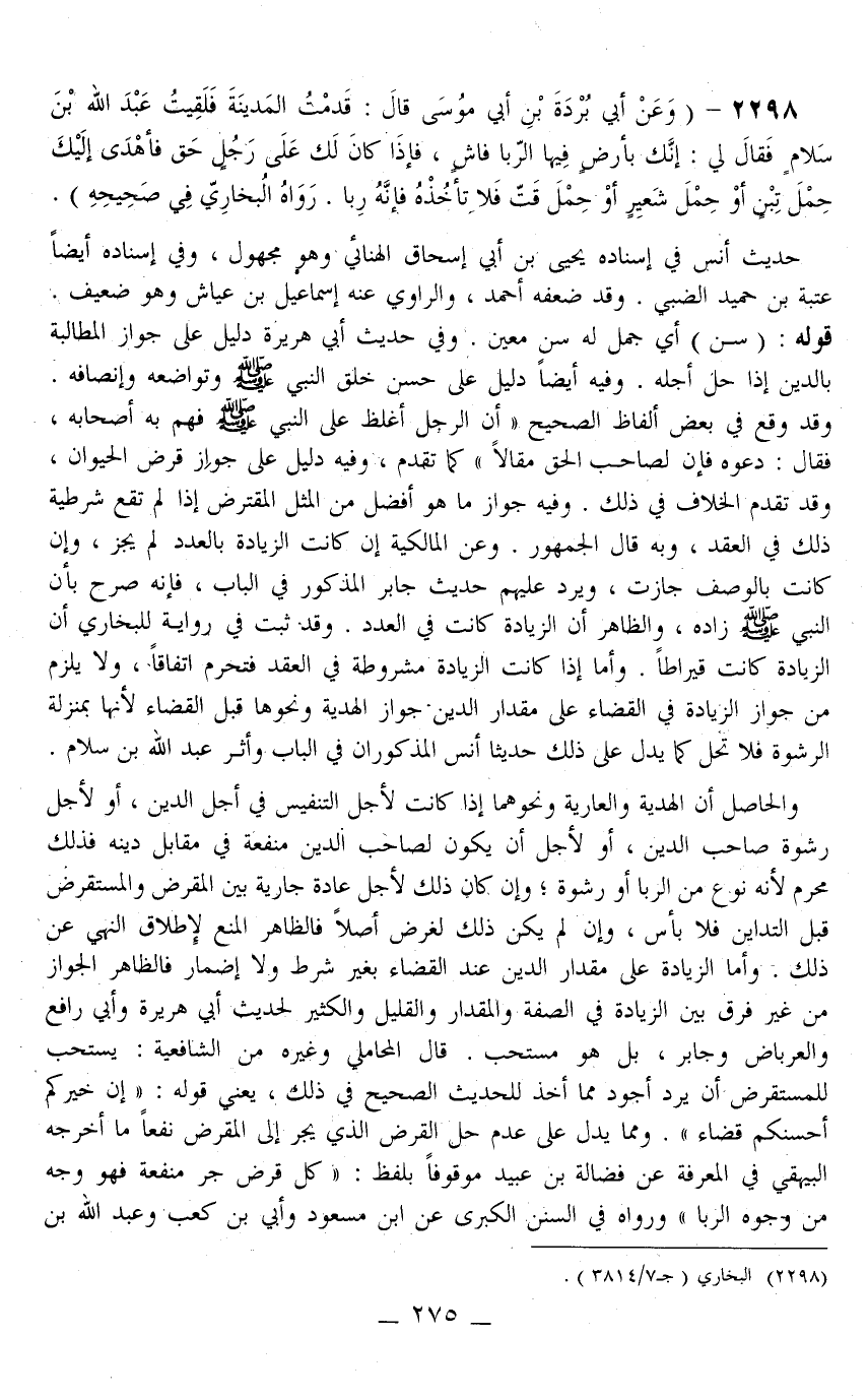 2298 - (وَعَنْ أَبِي بُرْدَةَ بْنِ أَبِي مُوسَى قَالَ: قَدِمْت الْمَدِينَةَ فَلَقِيتُ عَبْدَ اللَّهِ بْنَ سَلَامٍ فَقَالَ لِي: إنَّك بِأَرْضٍ فِيهَا الرِّبَا فَاشٍ، فَإِذَا كَانَ لَكَ عَلَى رَجُلٍ حَقٌّ فَأَهْدَى إلَيْكَ حِمْلَ تِبْنٍ أَوْ حِمْلَ شَعِيرٍ أَوْ حِمْلَ قَتٍّ فَلَا تَأْخُذْهُ فَإِنَّهُ رِبًا رَوَاهُ الْبُخَارِيُّ فِي صَحِيحِهِ)