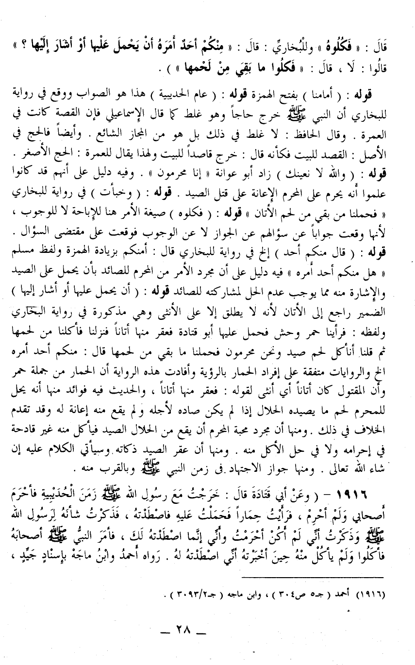 ـــــــــــــــــــــــــــــQقَالَ: فَكُلُوا مَا بَقِيَ مِنْ لَحْمِهَا) قَوْلُهُ: (أَمَامَنَا) بِفَتْحِ الْهَمْزَةِ قَوْلُهُ: (عَامَ الْحُدَيْبِيَةِ) هَذَا هُوَ الصَّوَابُ وَوَقَعَ فِي رِوَايَةٍ لِلْبُخَارِيِّ أَنَّ النَّبِيَّ - صَلَّى اللَّهُ عَلَيْهِ وَسَلَّمَ - خَرَجَ حَاجًّا وَهُوَ غَلَطٌ كَمَا قَالَ الْإِسْمَاعِيلِيُّ فَإِنَّ الْقِصَّةَ كَانَتْ فِي الْعُمْرَةِ وَقَالَ الْحَافِظُ: لَا غَلَطَ فِي ذَلِكَ بَلْ هُوَ مِنْ الْمَجَازِ الشَّائِعِ وَأَيْضًا فَالْحَجُّ فِي الْأَصْلِ: الْقَصْدُ لِلْبَيْتِ فَكَأَنَّهُ قَالَ: خَرَجَ قَاصِدًا لِلْبَيْتِ وَلِهَذَا يُقَالُ لِلْعُمْرَةِ: الْحَجُّ الْأَصْغَرُ قَوْلُهُ: (وَاَللَّهِ لَا نُعِينُكَ) زَادَ أَبُو عَوَانَةَ إنَّا مُحْرِمُونَ وَفِيهِ دَلِيلٌ عَلَى أَنَّهُمْ قَدْ كَانُوا عَلِمُوا أَنَّهُ يَحْرُمُ عَلَى الْمُحْرِمِ الْإِعَانَةُ عَلَى قَتْلِ الصَّيْدِ قَوْلُهُ: (وَخَبَّأْتُ) فِي رِوَايَةٍ لِلْبُخَارِيِّ فَحَمَلْنَا مَا بَقِيَ مِنْ لَحْمِ الْأَتَانِ قَوْلُهُ: (فَكُلُوهُ) صِيغَةُ الْأَمْرِ هُنَا لِلْإِبَاحَةِ لَا لِلْوُجُوبِ؛ لِأَنَّهَا وَقَعَتْ جَوَابًا عَنْ سُؤَالِهِمْ عَنْ الْجَوَازِ لَا عَنْ الْوُجُوبِ فَوَقَعَتْ عَلَى مُقْتَضَى السُّؤَالِ قَوْلُهُ: (قَالَ مِنْكُمْ أَحَدٌ) . . . إلَخْ فِي رِوَايَةٍ لِلْبُخَارِيِّ قَالَ: أَمِنْكُمْ بِزِيَادَةِ الْهَمْزَةِ وَلَفْظُ مُسْلِمٍ هَلْ مِنْكُمْ أَحَدٌ أَمَرَهُ فِيهِ دَلِيلٌ عَلَى أَنَّ مُجَرَّدَ الْأَمْرِ مِنْ الْمُحْرِمِ لِلصَّائِدِ بِأَنْ يَحْمِلَ عَلَى الصَّيْدِ وَالْإِشَارَةِ مِنْهُ مِمَّا يُوجِبُ عَدَمَ الْحِلِّ لِمُشَارَكَتِهِ لِلصَّائِدِ.