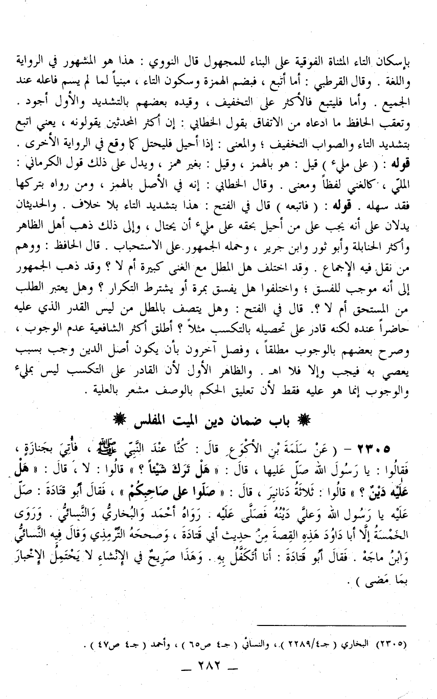 2305 - (عَنْ سَلَمَةَ بْنِ الْأَكْوَعِ قَالَ: «كُنَّا عِنْدَ النَّبِيِّ - صَلَّى اللَّهُ عَلَيْهِ وَسَلَّمَ - فَأُتِيَ بِجِنَازَةٍ، فَقَالُوا: يَا رَسُولَ اللَّهِ صَلِّ عَلَيْهَا، قَالَ: هَلْ تَرَكَ شَيْئًا؟ قَالُوا: لَا، فَقَالَ: هَلْ عَلَيْهِ دَيْنٌ؟ قَالُوا: ثَلَاثَةُ دَنَانِيرَ، قَالَ: صَلُّوا عَلَى صَاحِبِكُمْ، فَقَالَ أَبُو قَتَادَةَ: صَلِّ عَلَيْهِ يَا رَسُولَ اللَّهِ وَعَلَيَّ دَيْنُهُ فَصَلَّى عَلَيْهِ» رَوَاهُ أَحْمَدُ وَالْبُخَارِيُّ وَالنَّسَائِيُّ وَرَوَى الْخَمْسَةُ إلَّا أَبَا دَاوُد هَذِهِ الْقِصَّةَ مِنْ حَدِيثِ أَبِي قَتَادَةَ، وَصَحَّحَهُ التِّرْمِذِيُّ وَقَالَ فِيهِ النَّسَائِيّ وَابْنُ مَاجَهْ فَقَالَ أَبُو قَتَادَةَ: أَنَا أَتَكَفَّلُ بِهِ وَهَذَا صَرِيحٌ فِي الْإِنْشَاءِ لَا يَحْتَمِلُ الْإِخْبَارَ بِمَا مَضَى)