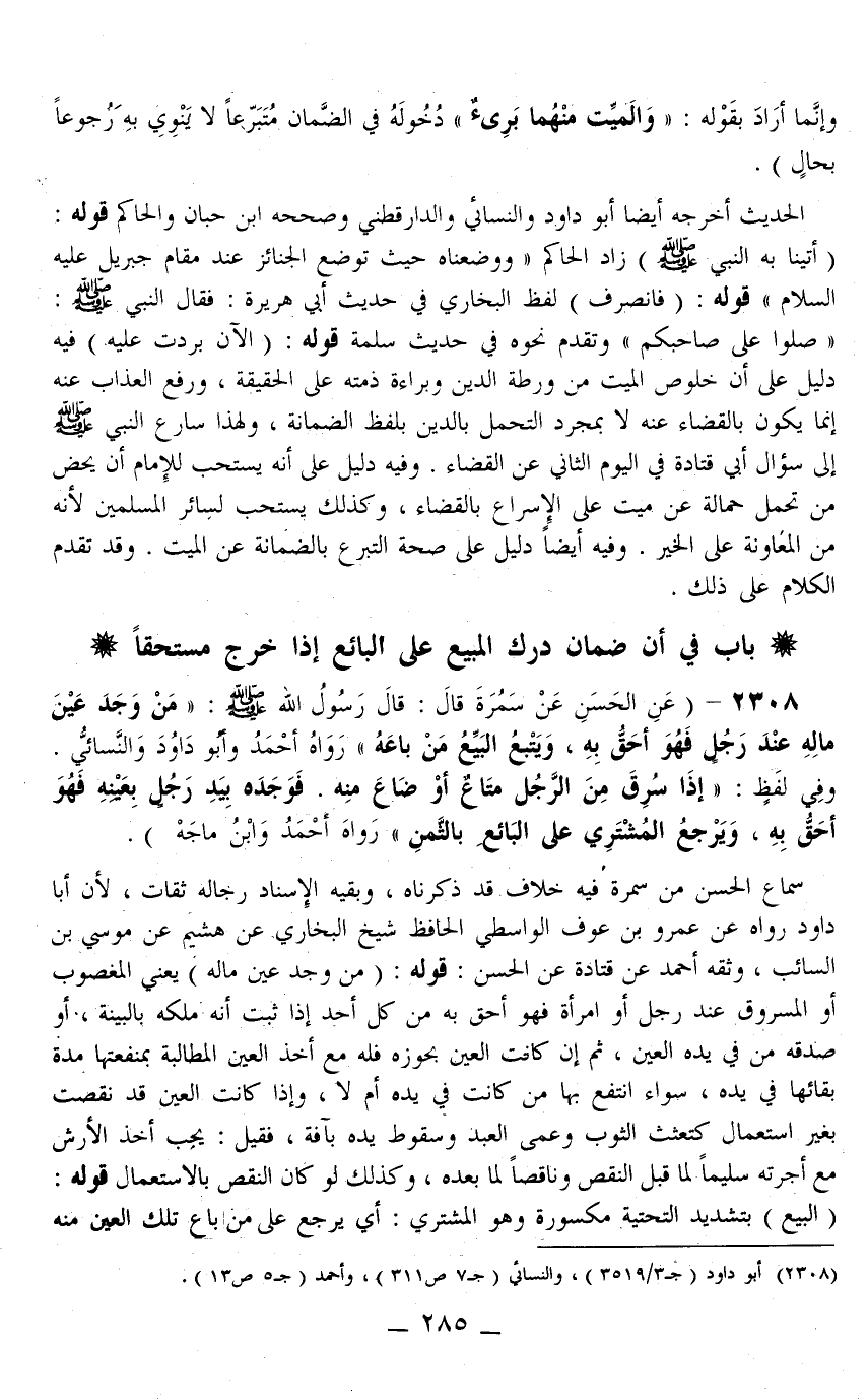 2308 - (عَنْ الْحَسَنِ عَنْ سَمُرَةَ قَالَ: قَالَ رَسُولُ اللَّهِ - صَلَّى اللَّهُ عَلَيْهِ وَسَلَّمَ -: «مَنْ وَجَدَ عَيْنَ مَالِهِ عِنْدَ رَجُلٍ فَهُوَ أَحَقُّ بِهِ، وَيَتْبَعُ الْبَيِّعُ مَنْ بَاعَهُ» رَوَاهُ أَحْمَدُ وَأَبُو دَاوُد وَالنَّسَائِيُّ وَفِي لَفْظٍ: «إذَا سُرِقَ مِنْ الرَّجُلِ مَتَاعٌ أَوْ ضَاعَ مِنْهُ فَوَجَدَهُ بِيَدِ رَجُلٍ بِعَيْنِهِ فَهُوَ أَحَقُّ بِهِ، وَيَرْجِعُ الْمُشْتَرِي عَلَى الْبَائِعِ بِالثَّمَنِ» رَوَاهُ أَحْمَدُ وَابْنُ مَاجَهْ)