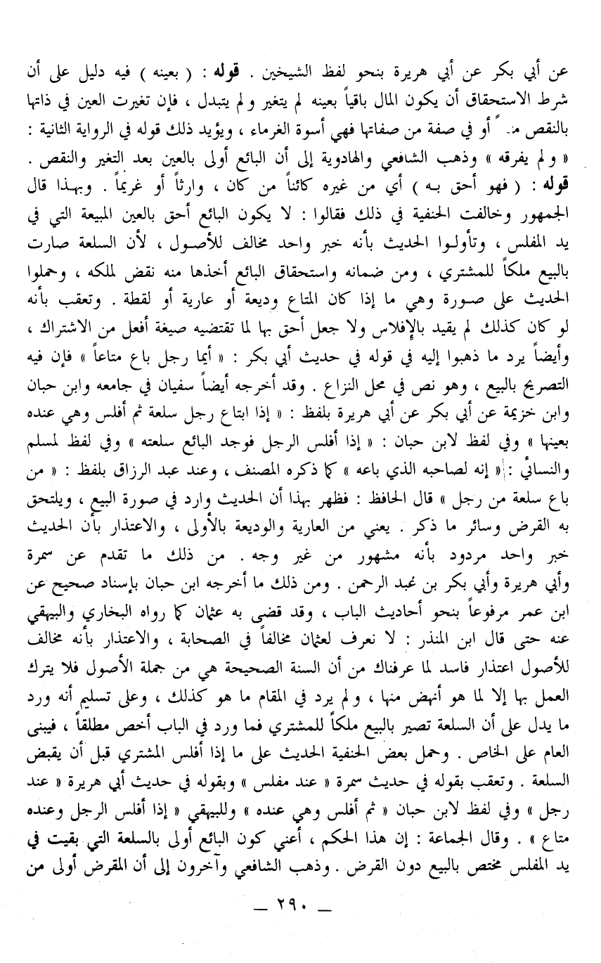 قَوْلُهُ: (بِعَيْنِهِ) فِيهِ دَلِيلٌ عَلَى أَنَّ شَرْطَ الِاسْتِحْقَاقِ أَنْ يَكُونَ الْمَالُ بَاقِيًا بِعَيْنِهِ لَمْ يَتَغَيَّرْ وَلَمْ يَتَبَدَّلْ، فَإِنْ تَغَيَّرَتْ الْعَيْنُ فِي ذَاتِهَا بِالنَّقْصِ مَثَلًا أَوْ فِي صِفَةٍ مِنْ صِفَاتِهَا فَهِيَ أُسْوَةُ الْغُرَمَاءِ، وَيُؤَيِّدُ ذَلِكَ قَوْلُهُ فِي الرِّوَايَةِ الثَّانِيَةِ: " وَلَمْ يُفَرِّقْهُ " وَذَهَبَ الشَّافِعِيُّ وَالْهَادَوِيَّةُ إلَى أَنَّ الْبَائِعَ أَوْلَى بِالْعَيْنِ بَعْدَ التَّغَيُّرِ وَالنَّقْصِ قَوْلُهُ: (فَهُوَ أَحَقُّ بِهِ) أَيْ: مِنْ غَيْرِهِ كَائِنًا مَنْ كَانَ، وَارِثًا أَوْ غَرِيمًا وَبِهَذَا قَالَ الْجُمْهُورُ وَخَالَفَتْ الْحَنَفِيَّةُ فِي ذَلِكَ فَقَالُوا: لَا يَكُونُ الْبَائِعُ أَحَقَّ بِالْعَيْنِ الْمَبِيعَةِ الَّتِي فِي يَدِ الْمُفْلِسِ، وَتَأَوَّلُوا الْحَدِيثَ بِأَنَّهُ خَبَرٌ وَاحِدٌ مُخَالِفٌ لِلْأُصُولِ؛ لِأَنَّ السِّلْعَةَ صَارَتْ بِالْبَيْعِ مِلْكًا لِلْمُشْتَرِي، وَمِنْ ضَمَانِهِ، وَاسْتِحْقَاقُ الْبَائِعِ أَخْذَهَا مِنْهُ نَقْضٌ لِمِلْكِهِ، وَحَمَلُوا الْحَدِيثَ عَلَى صُورَةٍ وَهِيَ مَا إذَا كَانَ الْمَتَاعُ وَدِيعَةً أَوْ عَارِيَّةً أَوْ لُقَطَةً وَتُعُقِّبَ بِأَنَّهُ لَوْ كَانَ كَذَلِكَ لَمْ يُقَيَّدْ بِالْإِفْلَاسِ وَلَا جُعِلَ أَحَقَّ بِهَا لِمَا تَقْتَضِيهِ صِيغَةُ أَفْعَلَ مِنْ الِاشْتِرَاكِ، وَأَيْضًا يَرُدُّ مَا ذَهَبُوا إلَيْهِ فِي قَوْلِهِ فِي حَدِيثِ أَبِي بَكْرٍ: «أَيُّمَا رَجُلٍ بَاعَ مَتَاعًا» فَإِنَّ فِيهِ التَّصْرِيحَ بِالْبَيْعِ، وَهُوَ نَصٌّ فِي مَحَلِّ النِّزَاعِ وَقَدْ أَخْرَجَهُ أَيْضًا سُفْيَانُ فِي جَامِعِهِ وَابْنُ حِبَّانَ وَابْنُ خُزَيْمَةَ عَنْ أَبِي بَكْرٍ عَنْ أَبِي هُرَيْرَةَ بِلَفْظِ: «إذَا ابْتَاعَ رَجُلٌ سِلْعَةً ثُمَّ أَفْلَسَ وَهِيَ عِنْدَهُ بِعَيْنِهَا» وَفِي لَفْظٍ لِابْنِ حِبَّانَ: «إذَا أَفْلَسَ الرَّجُلُ فَوَجَدَ الْبَائِعُ سِلْعَتَهُ» وَفِي لَفْظٍ لِمُسْلِمٍ وَالنَّسَائِيُّ: «إنَّهُ لِصَاحِبِهِ الَّذِي بَاعَهُ» كَمَا ذَكَرَهُ الْمُصَنِّفُ، وَعِنْدَ عَبْدِ الرَّزَّاقِ بِلَفْظِ: «مَنْ بَاعَ سِلْعَةً مِنْ رَجُلٍ»