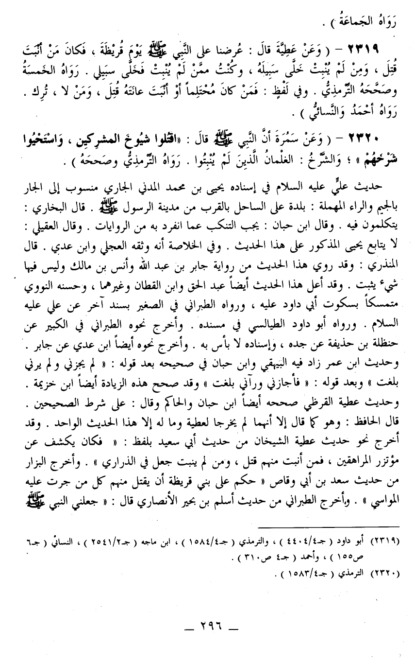 2319 - (وَعَنْ عَطِيَّةَ قَالَ: «عُرِضْنَا عَلَى النَّبِيِّ - صَلَّى اللَّهُ عَلَيْهِ وَسَلَّمَ - يَوْمَ قُرَيْظَةَ، فَكَانَ مَنْ أَنْبَتَ قُتِلَ، وَمَنْ لَمْ يُنْبِتْ خُلِّيَ سَبِيلُهُ، وَكُنْتُ مِمَّنْ لَمْ يُنْبِتْ فَخُلِّيَ سَبِيلِي» رَوَاهُ الْخَمْسَةُ وَصَحَّحَهُ التِّرْمِذِيُّ وَفِي لَفْظٍ: «فَمَنْ كَانَ مُحْتَلِمًا أَوْ نَبَتَتْ عَانَتُهُ قُتِلَ، وَمَنْ لَا تُرِكَ» رَوَاهُ أَحْمَدُ وَالنَّسَائِيُّ)
