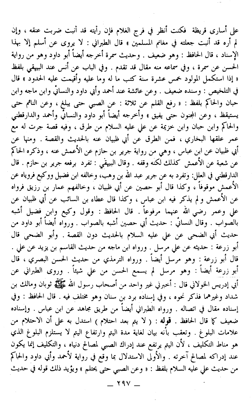 قَالَ الْحَافِظُ: وَهُوَ ضَعِيفٌ وَحَدِيثُ سَمُرَةَ أَخْرَجَهُ أَيْضًا أَبُو دَاوُد وَهُوَ مِنْ رِوَايَةِ الْحَسَنِ عَنْ سَمُرَةَ، وَفِي سَمَاعِهِ مِنْهُ مَقَالٌ قَدْ تَقَدَّمَ وَفِي الْبَابِ عَنْ أَنَسٍ عِنْدَ الْبَيْهَقِيّ بِلَفْظِ «إذَا اسْتَكْمَلَ الْمَوْلُودُ خَمْسَ عَشْرَةَ سَنَةً كُتِبَ مَا لَهُ وَمَا عَلَيْهِ وَأُقِيمَتْ عَلَيْهِ الْحُدُودُ» قَالَ فِي التَّلْخِيصِ: وَسَنَدُهُ ضَعِيفٌ وَعَنْ عَائِشَةَ عِنْدَ أَحْمَدَ وَأَبِي دَاوُد وَالنَّسَائِيُّ وَابْنِ مَاجَهْ وَابْنِ حِبَّانَ وَالْحَاكِمِ بِلَفْظِ: «رُفِعَ الْقَلَمُ عَنْ ثَلَاثَةٍ: عَنْ الصَّبِيِّ حَتَّى يَبْلُغَ، وَعَنْ النَّائِمِ حَتَّى يَسْتَيْقِظَ، وَعَنْ الْمَجْنُونِ حَتَّى يُفِيقَ» وَأَخْرَجَهُ أَيْضًا أَبُو دَاوُد وَالنَّسَائِيُّ وَأَحْمَدُ وَالدَّارَقُطْنِيّ وَالْحَاكِمُ وَابْنُ حِبَّانَ وَابْنُ خُزَيْمَةَ عَنْ عَلِيٍّ - عَلَيْهِ السَّلَامُ - مِنْ طُرُقٍ، وَفِيهِ قِصَّةٌ جَرَتْ لَهُ مَعَ عُمَرَ عَلَّقَهَا الْبُخَارِيُّ، فَمِنْ الطُّرُقِ عَنْ أَبِي ظَبْيَانَ عَنْهُ بِالْحَدِيثِ وَالْقِصَّةِ، وَمِنْهَا عَنْ أَبِي ظَبْيَانَ عَنْ ابْنِ عَبَّاسٍ، وَهِيَ مِنْ رِوَايَةِ جَرِيرِ بْنِ حَازِمٍ عَنْ الْأَعْمَشِ عَنْهُ، وَذَكَرَهُ الْحَاكِمُ عَنْ شُعْبَةَ عَنْ الْأَعْمَشِ كَذَلِكَ لَكِنَّهُ وَقَفَهُ، وَقَالَ الْبَيْهَقِيُّ: تَفَرَّدَ بِرَفْعِهِ جَرِيرُ بْنُ حَازِمٍ قَالَ الدَّارَقُطْنِيّ فِي الْعِلَلِ: وَتَفَرَّدَ بِهِ عَنْ جَرِيرٍ عَبْدُ اللَّهِ بْنُ وَهْبٍ، وَخَالَفَهُ ابْنُ فُضَيْلٍ وَوَكِيعٌ فَرَوَيَاهُ عَنْ الْأَعْمَشِ مَوْقُوفًا، وَكَذَا قَالَ أَبُو حُصَيْنٍ عَنْ أَبِي ظَبْيَانَ، وَخَالَفَهُمْ عَمَّارُ بْنُ زُرَيْقٍ فَرَوَاهُ عَنْ الْأَعْمَشِ وَلَمْ يَذْكُرْ فِيهِ ابْنَ عَبَّاسٍ، وَكَذَا قَالَ عَطَاءُ بْنُ السَّائِبِ عَنْ أَبِي ظَبْيَانَ عَنْ عَلِيٍّ وَعُمَرَ - رَضِيَ اللَّهُ عَنْهُمَا - مَرْفُوعًا قَالَ الْحَافِظُ: وَقَوْلُ وَكِيعٍ وَابْنِ فُضَيْلٍ أَشْبَهُ بِالصَّوَابِ وَقَالَ النَّسَائِيّ: حَدِيثُ أَبِي حُصَيْنٍ أَشْبَهُ بِالصَّوَابِ وَرَوَاهُ أَيْضًا أَبُو دَاوُد مِنْ حَدِيثِ أَبِي الضُّحَى عَنْ عَلِيٍّ - عَلَيْهِ السَّلَامُ - بِالْحَدِيثِ دُونَ الْقِصَّةِ وَأَبُو الضُّحَى قَالَ أَبُو زُرْعَةَ: حَدِيثُهُ عَنْ عَلِيٍّ مُرْسَلٌ وَرَوَاهُ ابْنُ مَاجَهْ مِنْ حَدِيثِ الْقَاسِمِ بْنِ يَزِيدَ عَنْ عَلِيٍّ قَالَ أَبُو زُرْعَةَ: وَهُوَ مُرْسَلٌ أَيْضًا وَرَوَاهُ التِّرْمِذِيُّ مِنْ حَدِيثِ الْحَسَنِ الْبَصْرِيِّ، قَالَ أَبُو زُرْعَةَ أَيْضًا: وَهُوَ مُرْسَلٌ لَمْ يَسْمَعْ الْحَسَنُ مِنْ عَلِيٍّ شَيْئًا وَرَوَى الطَّبَرَانِيُّ عَنْ أَبِي إدْرِيسَ الْخَوْلَانِيِّ قَالَ: أَخْبَرَنِي غَيْرُ وَاحِدٍ مِنْ أَصْحَابِ رَسُولِ اللَّهِ - صَلَّى اللَّهُ عَلَيْهِ وَسَلَّمَ - ثَوْبَانَ وَمَالِكِ بْنِ شَدَّادٍ وَغَيْرِهِمَا فَذَكَرَ نَحْوَهُ.