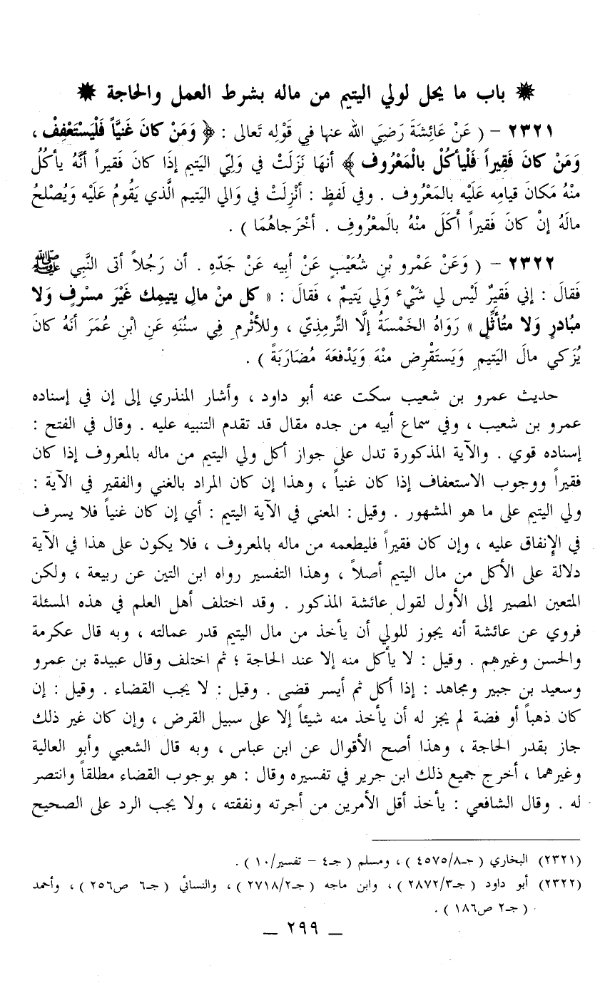 2322 - (وَعَنْ عَمْرِو بْنِ شُعَيْبٍ عَنْ أَبِيهِ عَنْ جَدِّهِ أَنَّ رَجُلًا أَتَى النَّبِيَّ - صَلَّى اللَّهُ عَلَيْهِ وَسَلَّمَ - فَقَالَ: إنِّي فَقِيرٌ لَيْسَ لِي شَيْءٌ وَلِي يَتِيمٌ، فَقَالَ: «كُلْ مِنْ مَالِ يَتِيمِكَ غَيْرَ مُسْرِفٍ وَلَا مُبَادِرٍ وَلَا مُتَأَثِّلٍ» رَوَاهُ الْخَمْسَةُ إلَّا التِّرْمِذِيَّ وَلِلْأَثْرَمِ فِي سُنَنِهِ عَنْ ابْنِ عُمَرَ أَنَّهُ كَانَ يُزَكِّي مَالَ الْيَتِيمِ وَيَسْتَقْرِضُ مِنْهُ وَيَدْفَعُهُ مُضَارَبَةً)