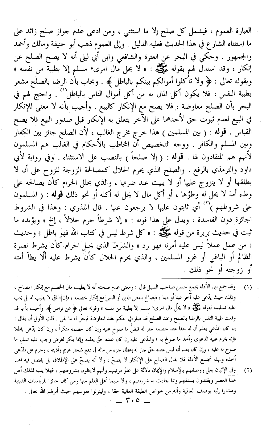 ـــــــــــــــــــــــــــــQالْعِبَارَةِ الْعُمُومُ، فَيَشْمَلُ كُلَّ صُلْحٍ إلَّا مَا اُسْتُثْنِيَ، وَمَنْ ادَّعَى عَدَمَ جَوَازِ صُلْحٍ زَائِدٍ عَلَى مَا اسْتَثْنَاهُ الشَّارِعُ فِي هَذَا الْحَدِيثِ فَعَلَيْهِ الدَّلِيلُ وَإِلَى الْعُمُومِ ذَهَبَ أَبُو حَنِيفَةَ وَمَالِكٌ وَأَحْمَدُ وَالْجُمْهُورُ وَحَكَى فِي الْبَحْرِ عَنْ الْعِتْرَةِ وَالشَّافِعِيِّ وَابْنِ أَبِي لَيْلَى أَنَّهُ لَا يَصِحُّ الصُّلْحُ عَنْ إنْكَارٍ، وَقَدْ اُسْتُدِلَّ لَهُمْ بِقَوْلِهِ - صَلَّى اللَّهُ عَلَيْهِ وَسَلَّمَ -: «لَا يَحِلُّ مَالُ امْرِئٍ مُسْلِمٍ إلَّا بِطِيبَةٍ مِنْ نَفْسِهِ» وَبِقَوْلِهِ تَعَالَى: {وَلا تَأْكُلُوا أَمْوَالَكُمْ بَيْنَكُمْ بِالْبَاطِلِ} [البقرة: 188] وَيُجَابُ بِأَنَّ الرِّضَا بِالصُّلْحِ مُشْعِرٌ بِطِيبَةِ النَّفْسِ، فَلَا يَكُونُ أَكْلُ الْمَالِ بِهِ مِنْ أَكْلِ أَمْوَالِ النَّاسِ بِالْبَاطِلِ وَاحْتَجَّ لَهُمْ فِي الْبَحْرِ بِأَنَّ الصُّلْحَ مُعَاوَضَةٌ، فَلَا يَصِحُّ مَعَ الْإِنْكَارِ كَالْبَيْعِ