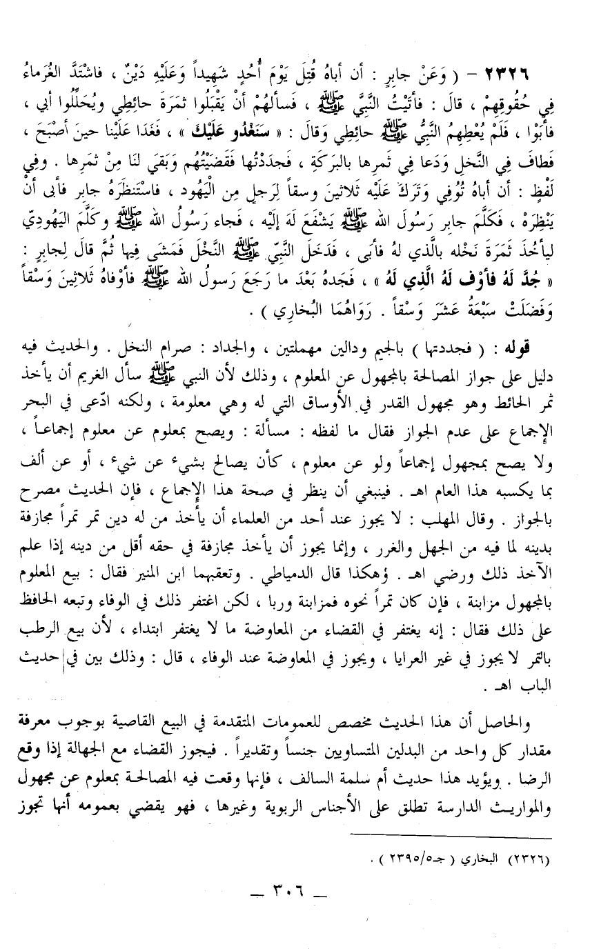 «وَعَنْ جَابِرٍ: أَنَّ أَبَاهُ قُتِلَ يَوْمَ أُحُدٍ شَهِيدًا وَعَلَيْهِ دَيْنٌ، فَاشْتَدَّ الْغُرَمَاءُ فِي حُقُوقِهِمْ، قَالَ: فَأَتَيْت النَّبِيَّ - صَلَّى اللَّهُ عَلَيْهِ وَسَلَّمَ - فَسَأَلَهُمْ أَنْ يَقْبَلُوا ثَمَرَةَ حَائِطِي وَيُحَلِّلُوا أَبِي، فَأَبَوْا، فَلَمْ يُعْطِهِمْ النَّبِيُّ - صَلَّى اللَّهُ عَلَيْهِ وَسَلَّمَ - حَائِطِي وَقَالَ: سَنَغْدُو عَلَيْكَ، فَغَدَا عَلَيْنَا حِينَ أَصْبَحَ، فَطَافَ فِي النَّخْلِ وَدَعَا فِي ثَمَرِهَا بِالْبَرَكَةِ، فَجَدَدْتُهَا فَقَضَيْتُهُمْ وَبَقِيَ لَنَا مِنْ ثَمَرِهَا» وَفِي لَفْظٍ: أَنَّ أَبَاهُ تُوُفِّيَ وَتَرَكَ عَلَيْهِ ثَلَاثِينَ وَسْقًا لِرَجُلٍ مِنْ الْيَهُودِ، فَاسْتَنْظَرَهُ جَابِرٌ فَأَبَى أَنْ يُنْظِرَهُ، فَكَلَّمَ جَابِرٌ رَسُولَ اللَّهِ - صَلَّى اللَّهُ عَلَيْهِ وَسَلَّمَ - لِيَشْفَعَ لَهُ إلَيْهِ، فَجَاءَ رَسُولُ اللَّهِ - صَلَّى اللَّهُ عَلَيْهِ وَسَلَّمَ - وَكَلَّمَ الْيَهُودِيَّ لِيَأْخُذَ ثَمَرَةَ نَخْلِهِ بِاَلَّذِي لَهُ فَأَبَى، فَدَخَلَ النَّبِيُّ - صَلَّى اللَّهُ عَلَيْهِ وَسَلَّمَ - النَّخْلَ فَمَشَى فِيهَا ثُمَّ قَالَ لِجَابِرٍ: " جُدَّ لَهُ فَأَوْفِ لَهُ الَّذِي لَهُ "، فَجَدَّهُ بَعْدَمَا رَجَعَ رَسُولُ اللَّهِ - صَلَّى اللَّهُ عَلَيْهِ وَسَلَّمَ - فَأَوْفَاهُ ثَلَاثِينَ وَسْقًا وَفَضَلَتْ سَبْعَةَ عَشَرَ وَسْقًا رَوَاهُمَا الْبُخَارِيُّ)
