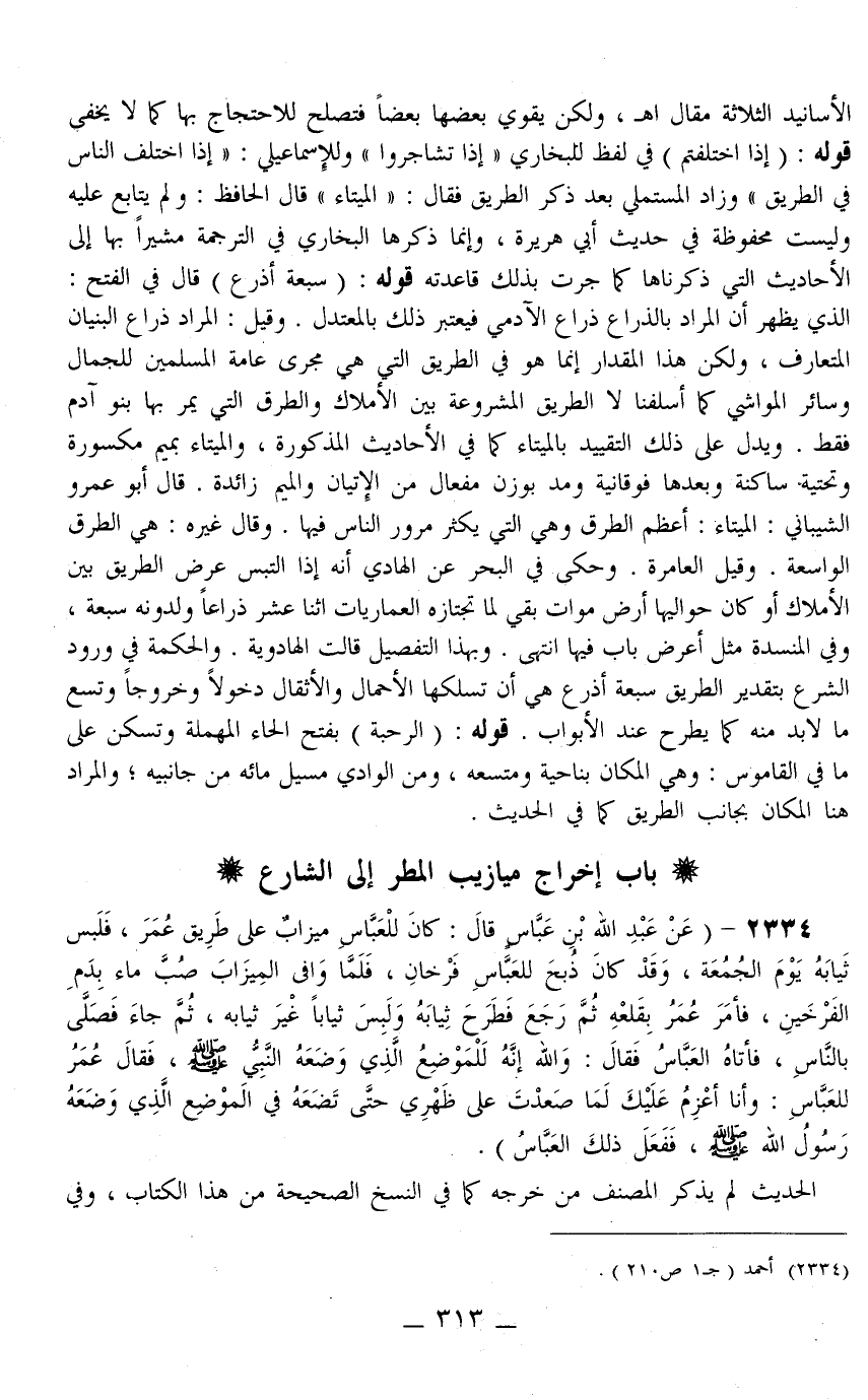 2334 - (عَنْ عَبْدِ اللَّهِ بْنِ عَبَّاسٍ قَالَ: «كَانَ لِلْعَبَّاسِ مِيزَابٌ عَلَى طَرِيقِ عُمَرَ، فَلَبِسَ ثِيَابَهُ يَوْمَ الْجُمُعَةِ، وَقَدْ كَانَ ذُبِحَ لِلْعَبَّاسِ: فَرْخَانِ فَلَمَّا وَافَى الْمِيزَابَ صُبَّ مَاءٌ بِدَمِ الْفَرْخَيْنِ، فَأَمَرَ عُمَرُ بِقَلْعِهِ ثُمَّ رَجَعَ فَطَرَحَ ثِيَابَهُ وَلَبِسَ ثِيَابًا غَيْرَ ثِيَابِهِ، ثُمَّ جَاءَ فَصَلَّى بِالنَّاسِ، فَأَتَاهُ الْعَبَّاسُ فَقَالَ: وَاَللَّهِ إنَّهُ لَلْمَوْضِعُ الَّذِي وَضَعَهُ النَّبِيُّ - صَلَّى اللَّهُ عَلَيْهِ وَسَلَّمَ -، فَقَالَ عُمَرُ لِلْعَبَّاسِ: وَأَنَا أَعْزِمُ عَلَيْكَ لَمَا صَعِدْت عَلَى ظَهْرِي حَتَّى تَضَعَهُ فِي الْمَوْضِعِ الَّذِي وَضَعَهُ رَسُولُ اللَّهِ - صَلَّى اللَّهُ عَلَيْهِ وَسَلَّمَ -، فَفَعَلَ ذَلِكَ الْعَبَّاسُ» )