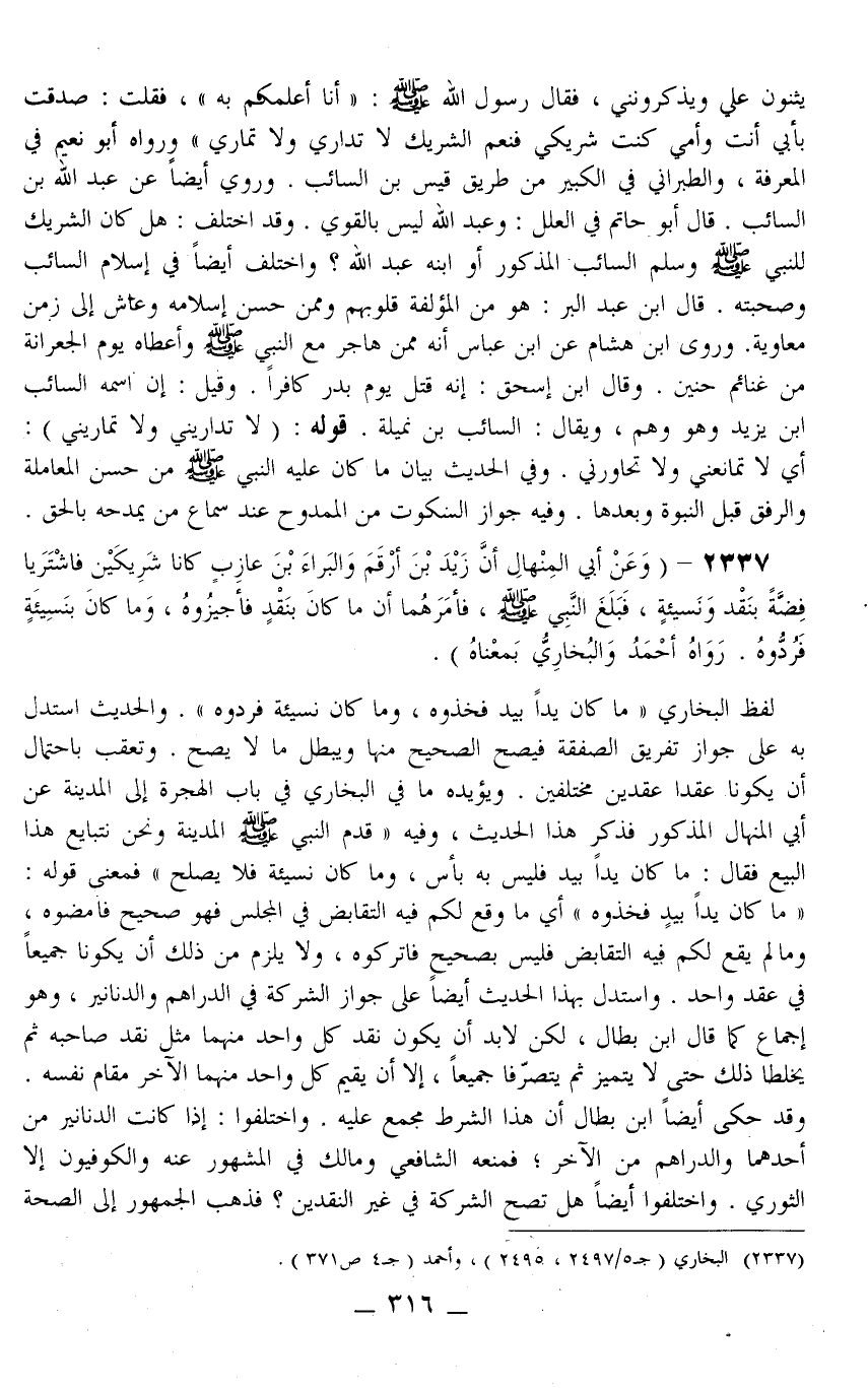 2337 - (وَعَنْ أَبِي الْمِنْهَالِ «أَنَّ زَيْدَ بْنَ أَرْقَمَ وَالْبَرَاءَ بْنَ عَازِبٍ كَانَا شَرِيكَيْنِ فَاشْتَرَيَا فِضَّةً بِنَقْدٍ وَنَسِيئَةٍ، فَبَلَغَ النَّبِيَّ - صَلَّى اللَّهُ عَلَيْهِ وَسَلَّمَ -، فَأَمَرَهُمَا أَنَّ مَا كَانَ بِنَقْدٍ فَأَجِيزُوهُ، وَمَا كَانَ بِنَسِيئَةٍ فَرُدُّوهُ» رَوَاهُ أَحْمَدُ وَالْبُخَارِيُّ بِمَعْنَاهُ)