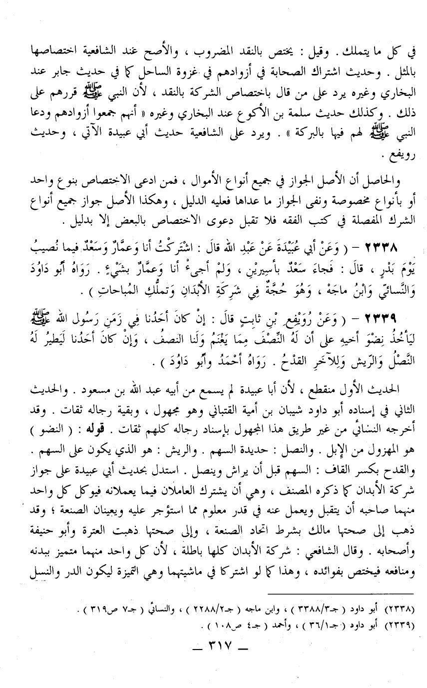 الْحَدِيثُ الْأَوَّلُ مُنْقَطِعٌ؛ لِأَنَّ أَبَا عُبَيْدَةَ لَمْ يَسْمَعْ مِنْ أَبِيهِ عَبْدِ اللَّهِ بْنِ مَسْعُودٍ وَالْحَدِيثُ الثَّانِي فِي إسْنَادِهِ أَبُو دَاوُد شَيْبَانُ بْنُ أُمَيَّةَ الْقِتْبَانِيُّ وَهُوَ مَجْهُولٌ، وَبَقِيَّةُ رِجَالِهِ ثِقَاتٌ وَقَدْ أَخْرَجَهُ النَّسَائِيّ مِنْ غَيْرِ طَرِيقِ هَذَا الْمَجْهُولِ بِإِسْنَادٍ رِجَالُهُ كُلُّهُمْ ثِقَاتٌ قَوْلُهُ: (النِّضْوُ) هُوَ الْمَهْزُولُ مِنْ الْإِبِلِ وَالنَّصْلُ: حَدِيدَةُ السَّهْمِ وَالرِّيشُ: هُوَ الَّذِي يَكُونُ عَلَى السَّهْمِ وَالْقِدْحُ بِكَسْرِ الْقَافِ: السَّهْمُ قَبْلَ أَنْ يُرَاشَ وَيُنْصَلَ اُسْتُدِلَّ بِحَدِيثِ أَبِي عُبَيْدَةَ عَلَى جَوَازِ شَرِكَةِ الْأَبْدَانِ كَمَا ذَكَرَهُ الْمُصَنِّفُ، وَهِيَ أَنْ يَشْتَرِكَ الْعَامِلَانِ فِيمَا يَعْمَلَانِهِ فَيُوَكِّلَ كُلُّ وَاحِدٍ مِنْهُمَا صَاحِبَهُ أَنْ يَتَقَبَّلَ وَيَعْمَلَ عَنْهُ فِي قَدْرٍ مَعْلُومٍ مِمَّا اُسْتُؤْجِرَ عَلَيْهِ وَيُعَيِّنَانِ الصَّنْعَةَ وَقَدْ ذَهَبَ إلَى صِحَّتِهَا مَالِكٌ بِشَرْطِ اتِّحَادِ الصَّنْعَةِ، وَإِلَى صِحَّتِهَا ذَهَبَتْ الْعِتْرَةُ وَأَبُو حَنِيفَةَ وَأَصْحَابُهُ