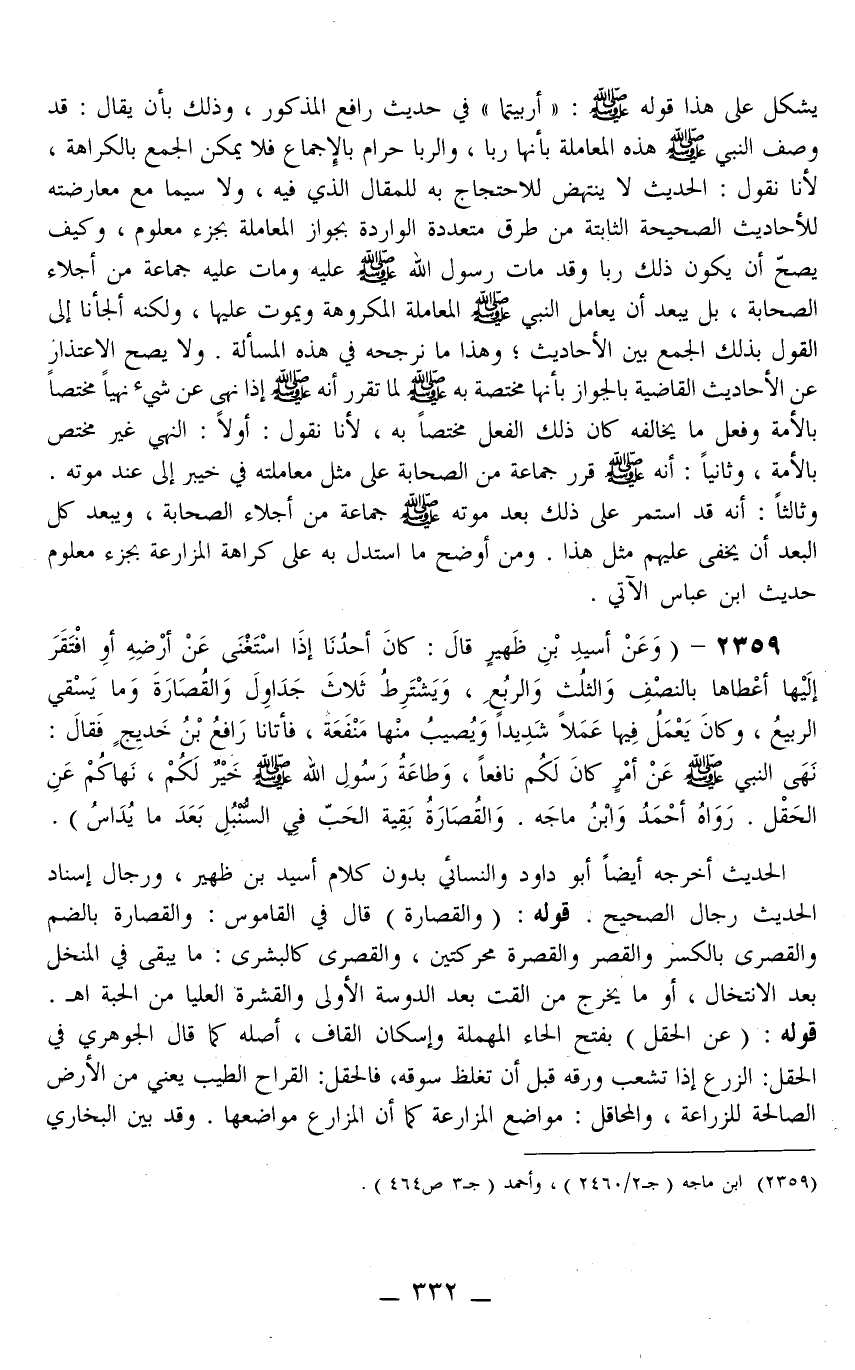 3259 - (وَعَنْ أَسِيد بْنِ ظُهَيْرٍ «قَالَ: كَانَ أَحَدُنَا إذَا اسْتَغْنَى عَنْ أَرْضِهِ أَوْ افْتَقَرَ إلَيْهَا أَعْطَاهَا بِالنِّصْفِ وَالثُّلُثِ وَالرُّبُعِ، وَيَشْتَرِطُ ثَلَاثَ جَدَاوِلَ وَالْقُصَارَةَ وَمَا يَسْقِي الرَّبِيعُ، وَكَانَ يَعْمَلُ فِيهَا عَمَلًا شَدِيدًا وَيُصِيبُ مِنْهَا مَنْفَعَةً، فَأَتَانَا رَافِعُ بْنُ خَدِيجٍ فَقَالَ: نَهَى النَّبِيُّ - صَلَّى اللَّهُ عَلَيْهِ وَسَلَّمَ - عَنْ أَمْرٍ كَانَ لَكُمْ نَافِعًا، وَطَاعَةُ رَسُولِ اللَّهِ - صَلَّى اللَّهُ عَلَيْهِ وَسَلَّمَ - خَيْرٌ لَكُمْ، نَهَاكُمْ عَنْ الْحَقْلِ» رَوَاهُ أَحْمَدُ وَابْنُ مَاجَهْ وَالْقُصَارَةُ بَقِيَّةُ الْحَبِّ فِي السُّنْبُلِ بَعْدَمَا يُدَاسُ) الْحَدِيثُ أَخْرَجَهُ أَيْضًا أَبُو دَاوُد وَالنَّسَائِيُّ بِدُونِ كَلَامِ أَسِيد بْنِ ظُهَيْرٍ، وَرِجَالُ إسْنَادِ الْحَدِيثِ رِجَالُ الصَّحِيحِ. قَوْلُهُ: (وَالْقُصَارَةَ) قَالَ فِي الْقَامُوسِ: وَالْقُصَارَةُ بِالضَّمِّ، وَالْقِصْرَى بِالْكَسْرِ وَالْقَصَرُ، وَالْقَصَرَةُ مُحَرَّكَتَيْنِ، وَالْقُصْرَى كَالْبُشْرَى: مَا يَبْقَى فِي الْمُنْخُلِ بَعْدَ الِانْتِخَالِ، أَوْ مَا يَخْرُجُ مِنْ الْقَتِّ بَعْدَ الدَّوْسَةِ الْأُولَى، وَالْقِشْرَةُ الْعُلْيَا مِنْ الْحَبَّةِ اهـ