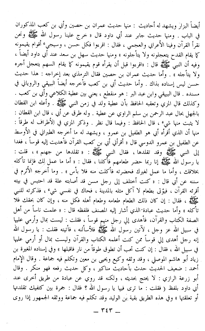 ـــــــــــــــــــــــــــــQأَيْضًا الْبَزَّارُ وَيَشْهَدُ لَهُ أَحَادِيثُ: مِنْهَا حَدِيثُ عِمْرَانَ بْنِ حُصَيْنٍ وَأُبَيُّ بْنِ كَعْبٍ الْمَذْكُورَانِ فِي الْبَابِ وَمِنْهَا حَدِيثُ جَابِرٍ عِنْدَ أَبِي دَاوُد قَالَ «خَرَجَ عَلَيْنَا رَسُولُ اللَّهِ - صَلَّى اللَّهُ عَلَيْهِ وَسَلَّمَ - وَنَحْنُ نَقْرَأُ الْقُرْآنَ وَفِينَا الْأَعْرَابِيُّ وَالْعَجَمِيُّ، فَقَالَ: اقْرَءُوا فَكُلٌّ حَسَنٌ، وَسَيَجِيءُ أَقْوَامٌ يُقِيمُونَهُ كَمَا يُقَامُ الْقِدْحُ يَتَعَجَّلُونَهُ وَلَا يَتَأَجَّلُونَهُ» وَمِنْهَا حَدِيثُ سَهْلِ بْنِ سَعْدٍ عِنْدَ أَبِي دَاوُد أَيْضًا، فِيهِ أَنَّ النَّبِيَّ - صَلَّى اللَّهُ عَلَيْهِ وَسَلَّمَ - قَالَ: «اقْرَءُوا قَبْلَ أَنْ يَقْرَأَهُ قَوْمٌ يُقِيمُونَهُ كَمَا يُقَوَّمُ السَّهْمُ يُتَعَجَّلُ أَجْرُهُ وَلَا يُتَأَجَّلُهُ» وَأَمَّا حَدِيثُ عِمْرَانَ بْنِ حُصَيْنٍ فَقَالَ التِّرْمِذِيُّ بَعْدَ إخْرَاجِهِ: هَذَا حَدِيثٌ حَسَنٌ لَيْسَ إسْنَادُهُ بِذَاكَ وَأَمَّا حَدِيثُ أُبَيِّ بْنِ كَعْبٍ فَأَخْرَجَهُ أَيْضًا الْبَيْهَقِيُّ وَالرُّويَانِيُّ فِي مُسْنَدِهِ قَالَ الْبَيْهَقِيُّ وَابْنُ عَبْدِ الْبَرِّ: هُوَ مُنْقَطِعٌ، يَعْنِي: بَيْنَ عَطِيَّةَ الْكَلَاعِيِّ وَأُبَيُّ بْنِ كَعْبٍ.