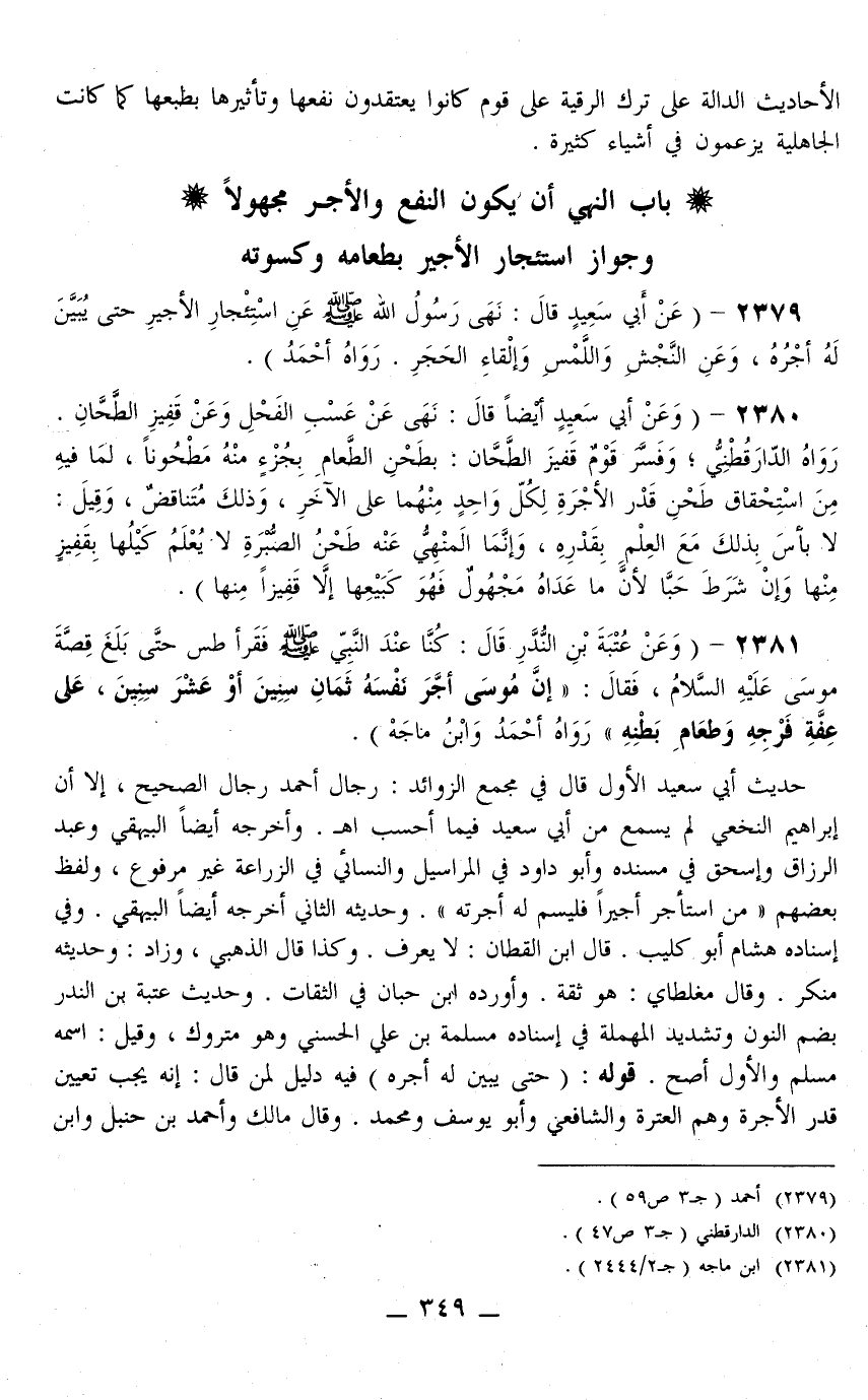2379 - (عَنْ أَبِي سَعِيدٍ قَالَ: «نَهَى رَسُولُ اللَّهِ - صَلَّى اللَّهُ عَلَيْهِ وَسَلَّمَ - عَنْ اسْتِئْجَارِ الْأَجِيرِ حَتَّى يُبَيَّنَ لَهُ أَجْرُهُ، وَعَنْ النَّجْشِ وَاللَّمْسِ وَإِلْقَاءِ الْحَجَرِ» رَوَاهُ أَحْمَدُ)