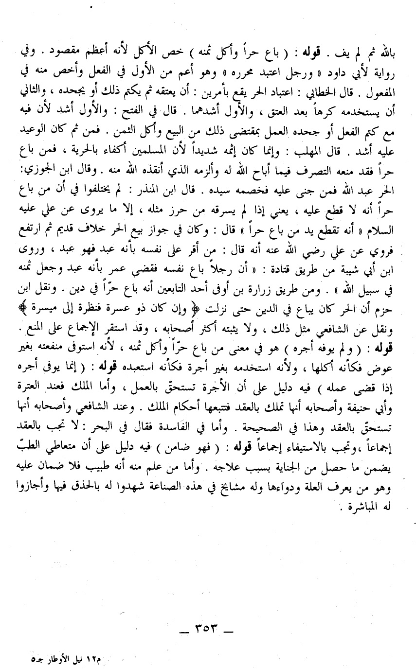 وَنَقَلَ ابْنُ حَزْمٍ أَنَّ الْحُرَّ كَانَ يُبَاعُ فِي الدَّيْنِ حَتَّى نَزَلَتْ {وَإِنْ كَانَ ذُو عُسْرَةٍ فَنَظِرَةٌ إِلَى مَيْسَرَةٍ} [البقرة: 280] وَنُقِلَ عَنْ الشَّافِعِيِّ مِثْلُ ذَلِكَ، وَلَا يُثْبِتُهُ أَكْثَرُ أَصْحَابِهِ، وَقَدْ اسْتَقَرَّ الْإِجْمَاعُ عَلَى الْمَنْعِ قَوْلُهُ: (وَلَمْ يُوَفِّهِ أَجْرَهُ) هُوَ فِي مَعْنَى مَنْ بَاعَ حُرًّا وَأَكَلَ ثَمَنَهُ؛ لِأَنَّهُ اسْتَوْفَى مَنْفَعَتَهُ بِغَيْرِ عِوَضٍ فَكَأَنَّهُ أَكَلَهَا، وَلِأَنَّهُ اسْتَخْدَمَهُ بِغَيْرِ أُجْرَةٍ فَكَأَنَّهُ اسْتَعْبَدَهُ قَوْلُهُ: (إنَّمَا يُوَفَّى أَجْرَهُ إذَا قَضَى عَمَلَهُ) فِيهِ دَلِيلٌ عَلَى أَنَّ الْأُجْرَةَ تُسْتَحَقُّ بِالْعَمَلِ، وَأَمَّا الْمِلْكُ فَعِنْدَ الْعِتْرَةِ وَأَبِي حَنِيفَةَ وَأَصْحَابِهِ أَنَّهَا تُمْلَكُ بِالْعَقْدِ فَتَتْبَعُهَا أَحْكَامُ الْمِلْكِ وَعِنْدَ الشَّافِعِيِّ وَأَصْحَابِهِ أَنَّهَا تُسْتَحَقُّ بِالْعَقْدِ وَهَذَا فِي الصَّحِيحَةِ وَأَمَّا الْفَاسِدَةُ فَقَالَ فِي الْبَحْرِ: لَا تَجِبُ بِالْعَقْدِ إجْمَاعًا، وَتَجِبُ بِالِاسْتِيفَاءِ إجْمَاعًا قَوْلُهُ: (فَهُوَ ضَامِنٌ) فِيهِ دَلِيلٌ عَلَى أَنَّ مُتَعَاطِيَ الطِّبِّ يَضْمَنُ لِمَا حَصَلَ مِنْ الْجِنَايَةِ بِسَبَبِ عِلَاجِهِ وَأَمَّا مَنْ عُلِمَ مِنْهُ أَنَّهُ طَبِيبٌ فَلَا ضَمَانَ عَلَيْهِ وَهُوَ مَنْ يَعْرِفُ الْعِلَّةَ وَدَوَاءَهَا وَلَهُ مَشَايِخُ فِي هَذِهِ الصِّنَاعَةِ شَهِدُوا لَهُ بِالْحِذْقِ فِيهَا وَأَجَازُوا لَهُ الْمُبَاشَرَةَ