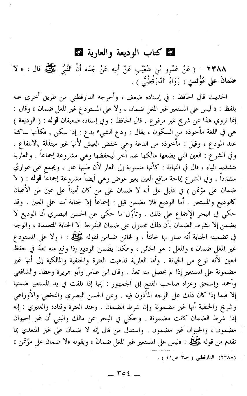 عَنْ عَمْرِو بْنِ شُعَيْبٍ عَنْ أَبِيهِ عَنْ جَدِّهِ أَنَّ النَّبِيَّ - صَلَّى اللَّهُ عَلَيْهِ وَسَلَّمَ - قَالَ: «لَا ضَمَانَ عَلَى مُؤْتَمَنٍ» رَوَاهُ الدَّارَقُطْنِيّ)