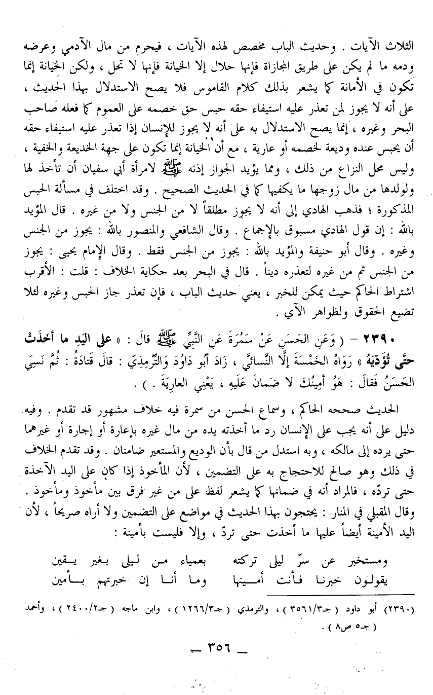 2390 - (وَعَنْ الْحَسَنِ عَنْ سَمُرَةَ عَنْ النَّبِيِّ - صَلَّى اللَّهُ عَلَيْهِ وَسَلَّمَ - قَالَ: «عَلَى الْيَدِ مَا أَخَذَتْ حَتَّى تُؤَدِّيَهُ» رَوَاهُ الْخَمْسَةُ إلَّا النَّسَائِيّ، زَادَ أَبُو دَاوُد وَالتِّرْمِذِيُّ: قَالَ قَتَادَةُ: ثُمَّ نَسِيَ الْحَسَنُ فَقَالَ: هُوَ أَمِينُكَ لَا ضَمَانَ عَلَيْهِ، يَعْنِي: الْعَارِيَّةَ) الْحَدِيثُ صَحَّحَهُ الْحَاكِمُ، وَسَمَاعُ الْحَسَنِ مِنْ سَمُرَةَ فِيهِ خِلَافٌ مَشْهُورٌ قَدْ تَقَدَّمَ