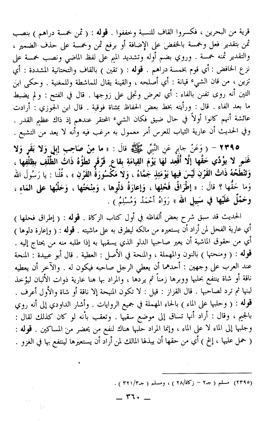 2395 - (وَعَنْ جَابِرٍ عَنْ النَّبِيِّ - صَلَّى اللَّهُ عَلَيْهِ وَسَلَّمَ - قَالَ: «مَا مِنْ صَاحِبِ إبِلٍ وَلَا بَقَرٍ وَلَا غَنَمٍ لَا يُؤَدِّي حَقَّهَا إلَّا أُقْعِدَ لَهَا يَوْمَ الْقِيَامَةِ بِقَاعٍ قَرْقَرٍ تَطَؤُهُ ذَاتُ الظِّلْفِ بِظِلْفِهَا، وَتَنْطَحُهُ ذَاتُ الْقَرْنِ لَيْسَ فِيهَا يَوْمَئِذٍ جَمَّاءُ، وَلَا مَكْسُورَةُ الْقَرْنِ، قُلْنَا: يَا رَسُولَ اللَّهِ وَمَا حَقُّهَا؟ قَالَ: إطْرَاقُ فَحْلِهَا، وَإِعَارَةُ دَلْوِهَا، وَمِنْحَتُهَا، وَحَلْبُهَا عَلَى الْمَاءِ، وَحَمْلٌ عَلَيْهَا فِي سَبِيلِ اللَّهِ» رَوَاهُ أَحْمَدُ وَمُسْلِمٌ) .