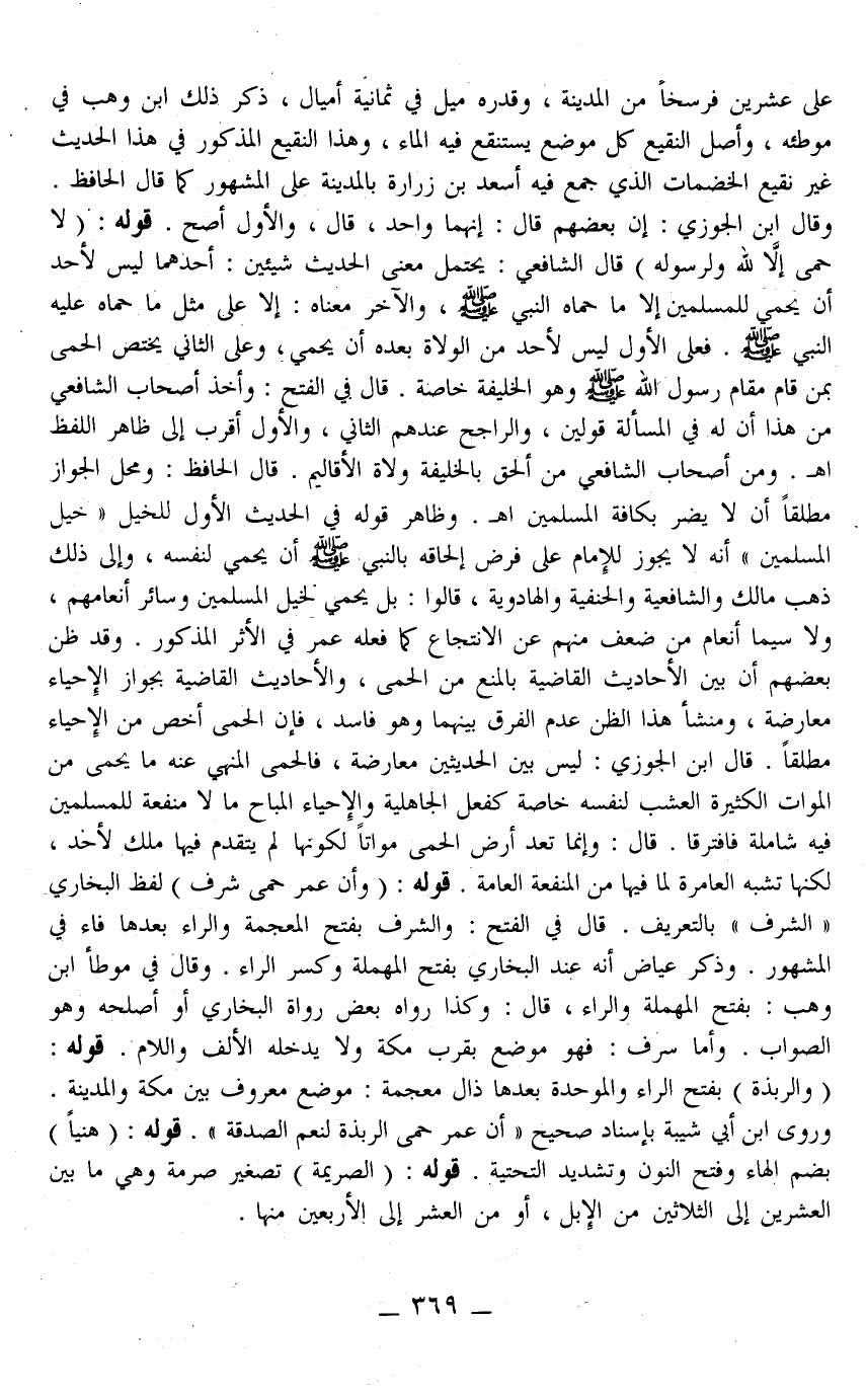 قَالَ ابْنُ الْجَوْزِيِّ: لَيْسَ بَيْنَ الْحَدِيثَيْنِ مُعَارَضَةٌ، فَالْحِمَى الْمَنْهِيُّ عَنْهُ مَا يُحْمَى مِنْ الْمَوَاتِ الْكَثِيرَةِ الْعُشْبِ لِنَفْسِهِ خَاصَّةً كَفِعْلِ الْجَاهِلِيَّةِ وَالْإِحْيَاءُ الْمُبَاحُ مَا لَا مَنْفَعَةَ لِلْمُسْلِمِينَ فِيهِ شَامِلَةً فَافْتَرَقَا قَالَ: وَإِنَّمَا تُعَدُّ أَرْضُ الْحِمَى مَوَاتَا لِكَوْنِهَا لَمْ يَتَقَدَّمْ فِيهَا مِلْكٌ لِأَحَدٍ، لَكِنَّهَا تُشْبِهُ الْعَامِرَةَ لِمَا فِيهَا مِنْ الْمَنْفَعَةِ الْعَامَّةِ قَوْلُهُ: (وَأَنَّ عُمَرَ حَمَى سَرِفَ) لَفْظُ الْبُخَارِيِّ " الشَّرَفُ " بِالتَّعْرِيفِ قَالَ فِي الْفَتْحِ: وَالشَّرَفُ بِفَتْحِ الْمُعْجَمَةِ وَالرَّاءِ بَعْدَهَا فَاءٌ فِي الْمَشْهُورِ، وَذَكَرَ عِيَاضٌ أَنَّهُ عِنْدَ الْبُخَارِيِّ بِفَتْحِ الْمُهْمَلَةِ وَكَسْرِ الرَّاءِ