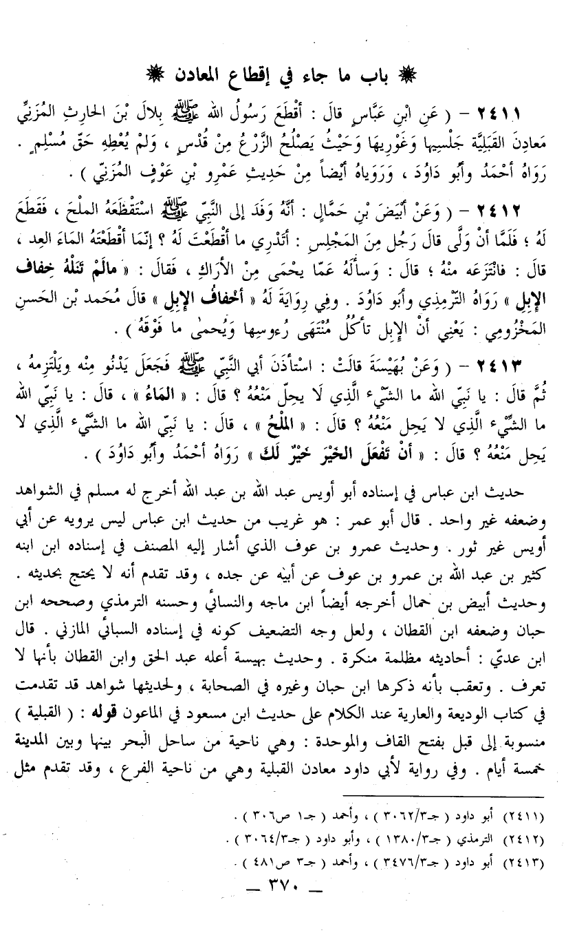 عَنْ ابْنِ عَبَّاسٍ قَالَ: «أَقْطَعَ رَسُولُ اللَّهِ - صَلَّى اللَّهُ عَلَيْهِ وَسَلَّمَ - بِلَالَ بْنَ الْحَارِثِ الْمُزَنِيّ مَعَادِنَ الْقَبَلِيَّةِ جَلْسِيَّهَا وَغَوْرِيَّهَا وَحَيْثُ يَصْلُحُ الزَّرْعُ مِنْ قُدْسٍ، وَلَمْ يُعْطِهِ حَقَّ مُسْلِمٍ» رَوَاهُ أَحْمَدُ وَأَبُو دَاوُد، وَرَوَيَاهُ أَيْضًا مِنْ حَدِيثِ عَمْرِو بْنِ عَوْفٍ الْمُزَنِيّ)