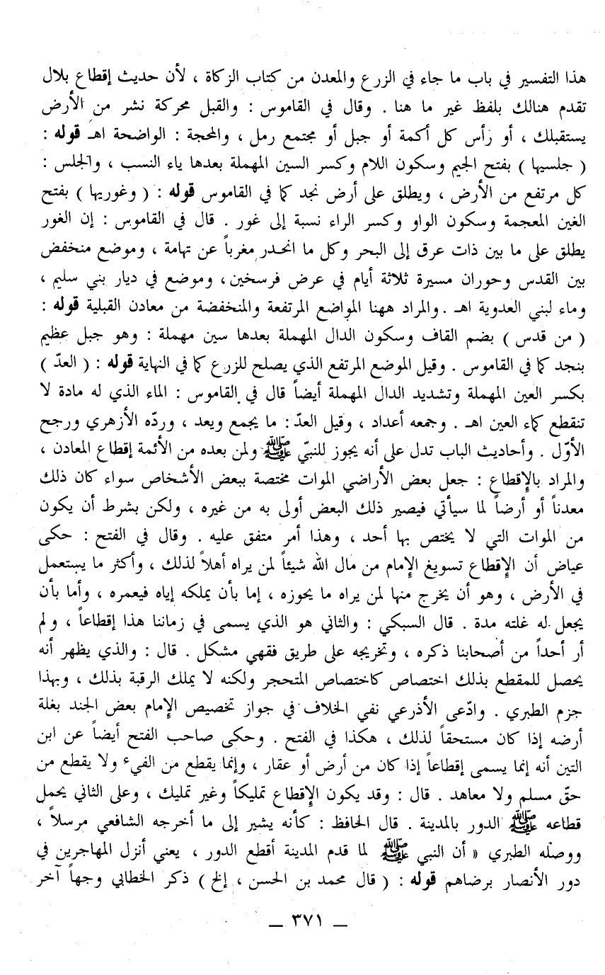 وَقَالَ فِي الْفَتْحِ: حَكَى عِيَاضٌ أَنَّ الْإِقْطَاعَ تَسْوِيغُ الْإِمَامِ مِنْ مَالِ اللَّهِ شَيْئًا لِمَنْ يَرَاهُ أَهْلًا لِذَلِكَ، وَأَكْثَرُ مَا يُسْتَعْمَلُ فِي الْأَرْضِ، وَهُوَ أَنْ يُخْرِجَ مِنْهَا لِمَنْ يَرَاهُ مَا يَحُوزُهُ، إمَّا بِأَنْ يُمَلِّكَهُ إيَّاهُ فَيُعْمِرَهُ، وَإِمَّا بِأَنْ يَجْعَلَ لَهُ غَلَّتَهُ مُدَّةً قَالَ السُّبْكِيُّ: وَالثَّانِي هُوَ الَّذِي يُسَمَّى فِي زَمَانِنَا هَذَا إقْطَاعَا، وَلَمْ أَرَ أَحَدًا مِنْ أَصْحَابِنَا ذَكَرَهُ، وَتَخْرِيجُهُ عَلَى طَرِيقٍ فِقْهِيٍّ مُشْكِلٌ قَالَ: وَاَلَّذِي يَظْهَرُ أَنَّهُ يَحْصُلُ لِلْمُقْطَعِ بِذَلِكَ اخْتِصَاصٌ كَاخْتِصَاصِ الْمُتَحَجِّرِ وَلَكِنَّهُ لَا يَمْلِكُ الرَّقَبَةَ بِذَلِكَ، وَبِهَذَا جَزَمَ الطَّبَرِيُّ وَادَّعَى الْأَذْرَعِيُّ نَفْيَ الْخِلَافِ فِي جَوَازِ تَخْصِيصِ الْإِمَامِ بَعْضَ الْجُنْدِ بِغَلَّةِ أَرْضِهِ إذَا كَانَ مُسْتَحِقًّا لِذَلِكَ، هَكَذَا فِي الْفَتْحِ