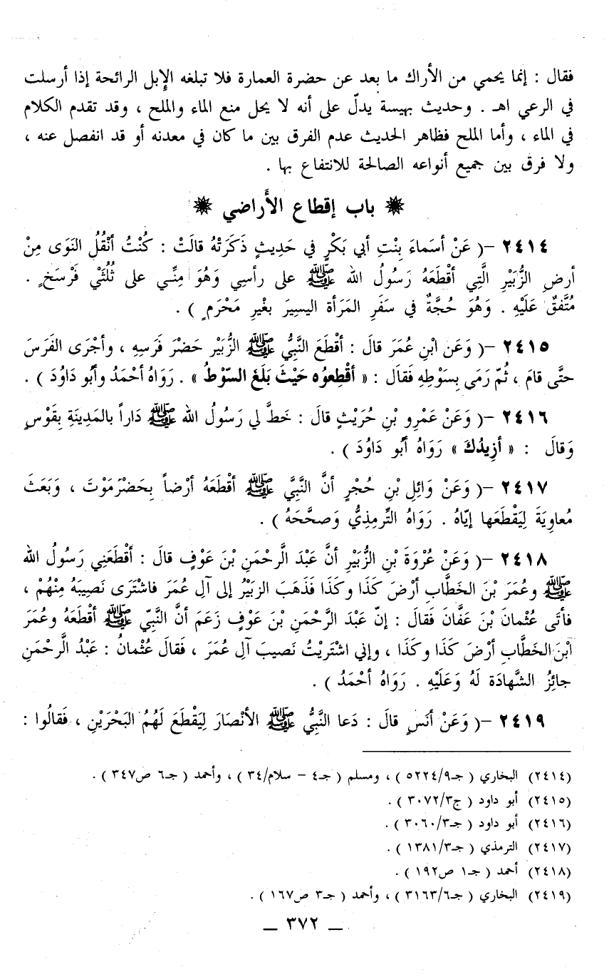 2415 - (وَعَنْ ابْنِ عُمَرَ قَالَ: «أَقْطَعَ النَّبِيُّ - صَلَّى اللَّهُ عَلَيْهِ وَسَلَّمَ - الزُّبَيْرَ حُضْرَ فَرَسِهِ، وَأَجْرَى الْفَرَسَ حَتَّى قَامَ، ثُمَّ رَمَى بِسَوْطِهِ فَقَالَ: أَقْطِعُوهُ حَيْثُ بَلَغَ السَّوْطُ» رَوَاهُ أَحْمَدُ وَأَبُو دَاوُد)