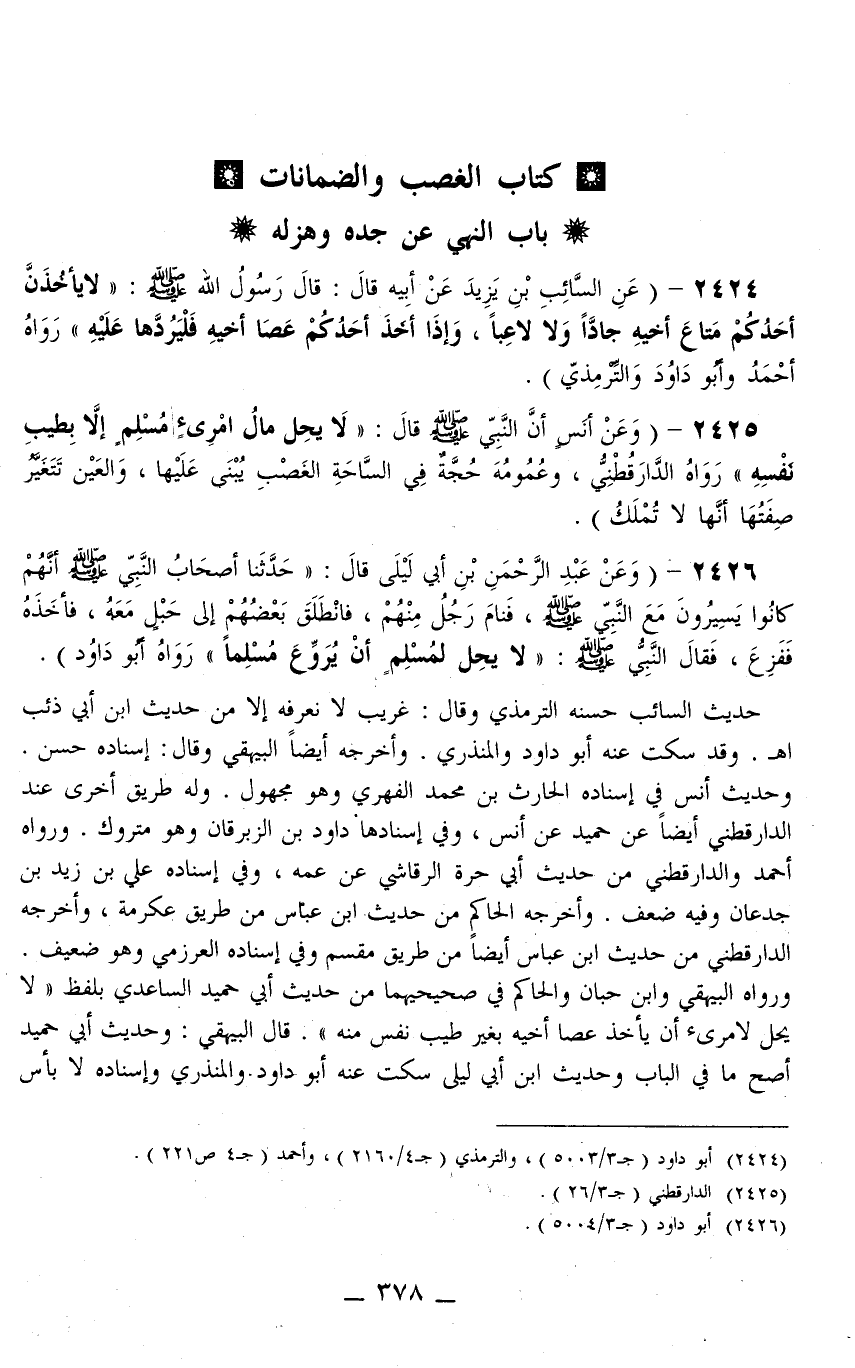 حَدِيثُ السَّائِبِ حَسَّنَهُ التِّرْمِذِيُّ وَقَالَ: غَرِيبٌ لَا نَعْرِفُهُ إلَّا مِنْ حَدِيثِ ابْنِ أَبِي ذِئْبٍ اهـ وَقَدْ سَكَتَ عَنْهُ أَبُو دَاوُد وَالْمُنْذِرِيُّ وَأَخْرَجَهُ أَيْضًا الْبَيْهَقِيُّ وَقَالَ: إسْنَادُهُ حَسَنٌ وَحَدِيثُ أَنَسٍ فِي إسْنَادِهِ الْحَارِثُ بْنُ مُحَمَّدٍ الْفِهْرِيُّ وَهُوَ مَجْهُولٌ وَلَهُ طَرِيقٌ أُخْرَى عِنْدَ الدَّارَقُطْنِيّ أَيْضًا عَنْ حُمَيْدٍ عَنْ أَنَسٍ، وَفِي إسْنَادِهَا دَاوُد بْنُ الزِّبْرِقَانِ وَهُوَ مَتْرُوكٌ وَرَوَاهُ أَحْمَدُ وَالدَّارَقُطْنِيّ مِنْ حَدِيثِ أَبِي حَرَّةَ الرَّقَاشِيُّ عَنْ عَمِّهِ، وَفِي إسْنَادِهِ عَلِيُّ بْنُ زَيْدِ بْنِ جُدْعَانَ وَفِيهِ ضَعْفٌ وَأَخْرَجَهُ الْحَاكِمُ مِنْ حَدِيثِ ابْنِ عَبَّاسٍ مِنْ طَرِيقِ عِكْرِمَةَ، وَأَخْرَجَهُ الدَّارَقُطْنِيّ مِنْ حَدِيثِ ابْنِ عَبَّاسٍ أَيْضًا مِنْ طَرِيقِ مِقْسَمٍ وَفِي إسْنَادِهِ الْعَرْزَمِيُّ وَهُوَ ضَعِيفٌ وَرَوَاهُ الْبَيْهَقِيُّ وَابْنُ حِبَّانَ وَالْحَاكِمُ فِي صَحِيحَيْهِمَا مِنْ حَدِيثِ أَبِي حُمَيْدٍ السَّاعِدِيِّ بِلَفْظِ «لَا يَحِلُّ لِامْرِئٍ أَنْ يَأْخُذَ عَصَا أَخِيهِ بِغَيْرِ طِيبِ نَفْسٍ مِنْهُ» قَالَ الْبَيْهَقِيُّ: وَحَدِيثُ أَبِي حُمَيْدٍ أَصَحُّ مَا فِي الْبَابِ وَحَدِيثُ ابْنِ أَبِي لَيْلَى سَكَتَ عَنْهُ أَبُو دَاوُد وَالْمُنْذِرِيُّ وَإِسْنَادُهُ لَا بَأْسَ