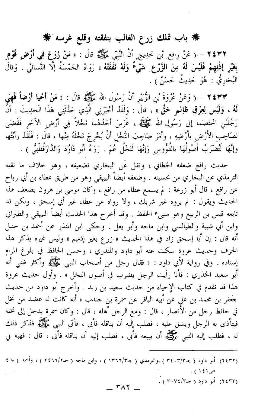 حَدِيثُ رَافِعٍ ضَعَّفَهُ الْخَطَّابِيِّ، وَنُقِلَ عَنْ الْبُخَارِيِّ تَضْعِيفُهُ، وَهُوَ خِلَافُ مَا نَقَلَهُ التِّرْمِذِيُّ عَنْ الْبُخَارِيِّ مِنْ تَحْسِينِهِ وَضَعَّفَهُ أَيْضًا الْبَيْهَقِيُّ وَهُوَ مِنْ طَرِيقِ عَطَاءِ بْنِ أَبِي رَبَاحٍ عَنْ رَافِعٍ، قَالَ أَبُو زُرْعَةَ: لَمْ يَسْمَعْ عَطَاءٌ مِنْ رَافِعٍ، وَكَانَ مُوسَى بْنُ هَارُونَ يُضَعِّفُ هَذَا الْحَدِيثَ وَيَقُولُ: لَمْ يَرْوِهِ غَيْرُ شَرِيكٍ، وَلَا رَوَاهُ عَنْ عَطَاءٍ غَيْرُ أَبِي إِسْحَاقَ، وَلَكِنْ قَدْ تَابَعَهُ قَيْسُ بْنُ الرَّبِيعِ وَهُوَ سَيِّئُ الْحِفْظِ وَقَدْ أَخْرَجَ هَذَا الْحَدِيثَ أَيْضًا الْبَيْهَقِيُّ وَالطَّبَرَانِيُّ وَابْنُ أَبِي شَيْبَةَ وَالطَّيَالِسِيُّ وَابْنُ مَاجَهْ وَأَبُو يَعْلَى وَحَكَى ابْنُ الْمُنْذِرِ عَنْ أَحْمَدَ بْنِ حَنْبَلٍ أَنَّهُ قَالَ: إنَّ أَبَا إِسْحَاقَ زَادَ فِي هَذَا الْحَدِيثِ " زَرَعَ بِغَيْرِ إذْنِهِمْ " وَلَيْسَ غَيْرُهُ يَذْكُرُ هَذَا الْحَرْفَ وَحَدِيثُ عُرْوَةَ سَكَتَ عَنْهُ أَبُو دَاوُد وَالْمُنْذِرِيُّ، وَحَسَّنَ الْحَافِظُ فِي بُلُوغِ الْمَرَامِ إسْنَادَهُ وَفِي رِوَايَةٍ لِأَبِي دَاوُد: «فَقَالَ رَجُلٌ مِنْ أَصْحَابِ النَّبِيِّ - صَلَّى اللَّهُ عَلَيْهِ وَسَلَّمَ - وَأَكْثَرُ ظَنِّي أَنَّهُ أَبُو سَعِيدٍ الْخُدْرِيِّ: فَأَنَا رَأَيْت الرَّجُلَ يَضْرِبُ فِي أُصُولِ النَّخْلِ» وَأَوَّلُ حَدِيثِ عُرْوَةَ هَذَا قَدْ تَقَدَّمَ فِي كِتَابِ الْإِحْيَاءِ مِنْ حَدِيثِ سَعِيدِ بْنِ زَيْدٍ وَأَخْرَجَ أَبُو دَاوُد مِنْ حَدِيثِ جَعْفَرِ بْنِ مُحَمَّدِ بْنِ عَلِيٍّ عَنْ أَبِيهِ الْبَاقِرِ عَنْ سَمُرَةَ بْنِ جُنْدَبٍ «أَنَّهُ كَانَتْ لَهُ عَضُدٌ مِنْ نَخْلٍ فِي حَائِطِ رَجُلٍ مِنْ الْأَنْصَارِ، قَالَ: وَمَعَ الرَّجُلِ أَهْلُهُ، قَالَ: وَكَانَ سَمُرَةُ يَدْخُلُ إلَى نَخْلِهِ فَيَتَأَذَّى بِهِ الرَّجُلُ وَيَشُقُّ عَلَيْهِ، فَطَلَبَ إلَيْهِ أَنْ يُنَاقِلَهُ فَأَبَى، فَأَتَى النَّبِيَّ - صَلَّى اللَّهُ عَلَيْهِ وَسَلَّمَ - فَذَكَرَ ذَلِكَ لَهُ، فَطَلَبَ إلَيْهِ النَّبِيُّ - صَلَّى اللَّهُ عَلَيْهِ وَسَلَّمَ - أَنْ يَبِيعَهُ فَأَبَى، فَطَلَبَ إلَيْهِ أَنْ يُنَاقِلَهُ فَأَبَى قَالَ: فَهَبْهُ لِي
