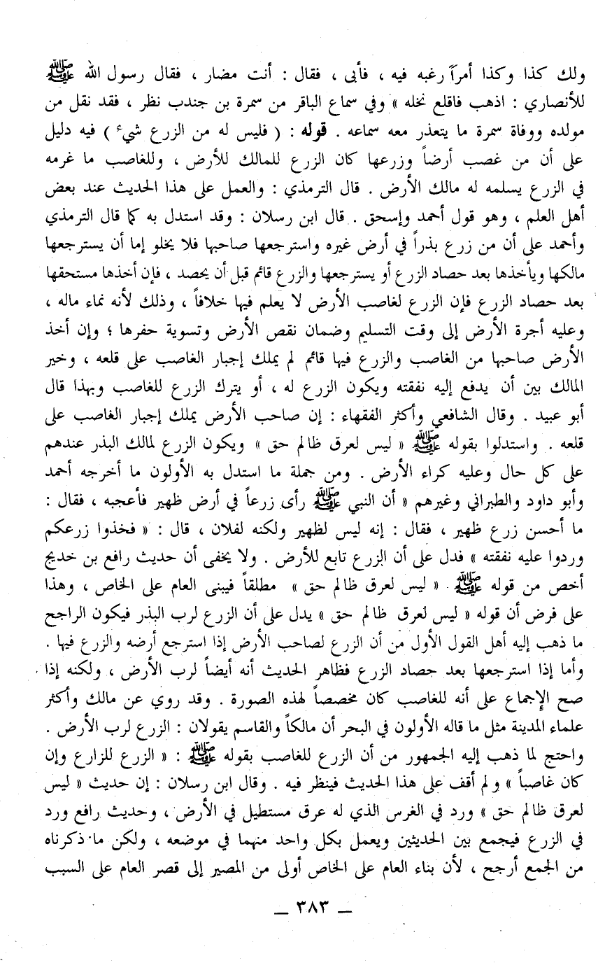 وَقَدْ رُوِيَ عَنْ مَالِكٍ وَأَكْثَرَ عُلَمَاءِ الْمَدِينَةِ مِثْلُ مَا قَالَهُ الْأَوَّلُونَ، فِي الْبَحْرِ أَنَّ مَالِكًا وَالْقَاسِمَ يَقُولَانِ: الزَّرْعُ لِرَبِّ الْأَرْضِ وَاحْتَجَّ لِمَا ذَهَبَ إلَيْهِ الْجُمْهُورُ مِنْ أَنَّ الزَّرْعَ لِلْغَاصِبِ بِقَوْلِهِ - صَلَّى اللَّهُ عَلَيْهِ وَسَلَّمَ -: «الزَّرْعُ لِلزَّارِعِ وَإِنْ كَانَ غَاصِبًا» وَلَمْ أَقِفْ عَلَى هَذَا الْحَدِيثِ فَيُنْظَرُ فِيهِ وَقَالَ ابْنُ رِسْلَانَ: إنَّ حَدِيثَ " لَيْسَ لِعِرْقٍ ظَالِمٍ حَقٌّ " وَرَدَ فِي الْغَرْسِ الَّذِي لَهُ عِرْقٌ مُسْتَطِيلٌ فِي الْأَرْضِ، وَحَدِيثُ رَافِعٍ وَرَدَ فِي الزَّرْعِ فَيُجْمَعُ بَيْنَ الْحَدِيثَيْنِ وَيُعْمَلُ بِكُلِّ وَاحِدٍ مِنْهُمْ فِي مَوْضِعِهِ، وَلَكِنْ مَا ذَكَرْنَاهُ مِنْ الْجَمْعِ أَرْجَحُ، لِأَنَّ بِنَاءَ الْعَامِّ عَلَى الْخَاصِّ أَوْلَى مِنْ الْمَصِيرِ إلَى قَصْرِ الْعَامِّ عَلَى السَّبَبِ