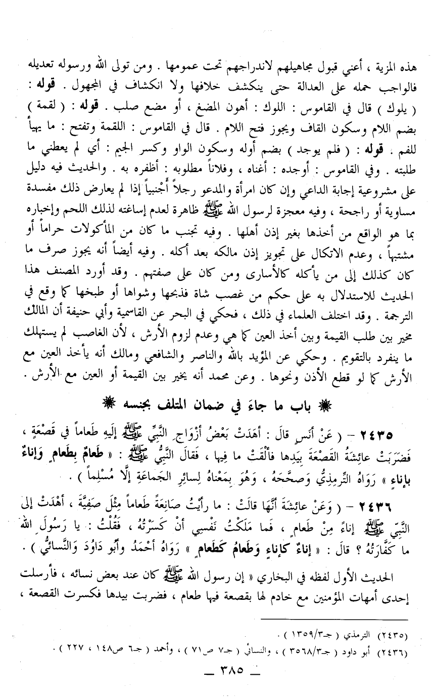 2435 - (عَنْ أَنَسٍ قَالَ: «أَهْدَتْ بَعْضُ أَزْوَاجِ النَّبِيِّ - صَلَّى اللَّهُ عَلَيْهِ وَسَلَّمَ - إلَيْهِ طَعَامًا فِي قَصْعَةٍ، فَضَرَبَتْ عَائِشَةُ الْقَصْعَةَ بِيَدِهَا فَأَلْقَتْ مَا فِيهَا، فَقَالَ النَّبِيُّ - صَلَّى اللَّهُ عَلَيْهِ وَسَلَّمَ -: طَعَامٌ بِطَعَامٍ وَإِنَاءٌ بِإِنَاءٍ» رَوَاهُ التِّرْمِذِيُّ وَصَحَّحَهُ، وَهُوَ بِمَعْنَاهُ لِسَائِرِ الْجَمَاعَةِ إلَّا مُسْلِمًا) .