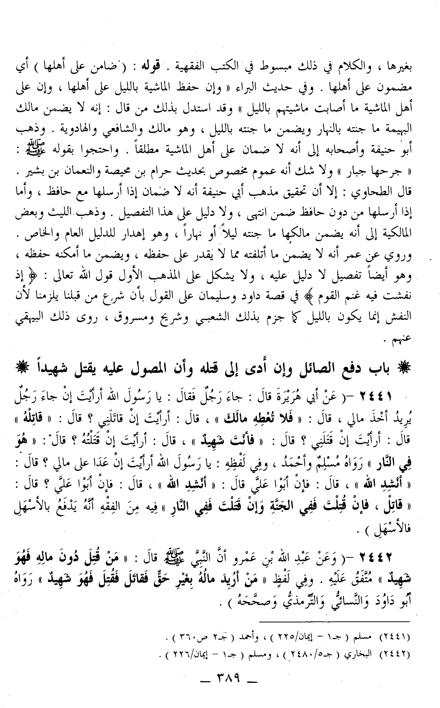 2441 - (عَنْ أَبِي هُرَيْرَةَ قَالَ: «جَاءَ رَجُلٌ فَقَالَ: يَا رَسُولَ اللَّهِ أَرَأَيْت إنْ جَاءَ رَجُلٌ يُرِيدُ أَخْذَ مَالِي، قَالَ: فَلَا تُعْطِهِ مَالَك، قَالَ: أَرَأَيْت إنْ قَاتَلَنِي؟ قَالَ: قَاتِلْهُ قَالَ: أَرَأَيْت إنْ قَتَلَنِي؟ قَالَ: فَأَنْتَ شَهِيدٌ، قَالَ: أَرَأَيْت إنْ قَتَلْته؟ قَالَ: هُوَ فِي النَّارِ» رَوَاهُ مُسْلِمٌ وَأَحْمَدُ، وَفِي لَفْظِهِ: يَا رَسُولَ اللَّهِ أَرَأَيْت إنْ عَدَا عَلَى مَالِي؟ قَالَ: " أَنْشِدْ اللَّهَ "، قَالَ: فَإِنْ أَبَوْا عَلَيَّ قَالَ: " أَنْشِدْ اللَّهَ "، قَالَ: فَإِنْ أَبَوْا عَلَيَّ؟ قَالَ: " قَاتِلْ، فَإِنْ قُتِلْتَ فَفِي الْجَنَّةِ وَإِنْ قَتَلْتَ فَفِي النَّارِ " فِيهِ مِنْ الْفِقْهِ أَنَّهُ يُدْفَعُ بِالْأَسْهَلِ فَالْأَسْهَلِ) .