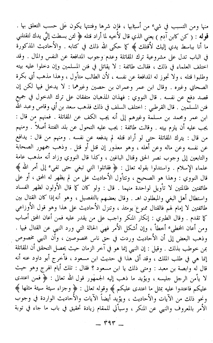 ـــــــــــــــــــــــــــــQمِنْهَا وَمِنْ التَّسَبُّبِ فِي شَيْءٍ مِنْ أَسْبَابِهَا، فَإِنَّ شَرَّهَا وَفِتْنَتَهَا يَكُونُ عَلَى حَسَبِ التَّعَلُّقِ بِهَا قَوْلُهُ: (كُنْ كَابْنِ آدَمَ) يَعْنِي: الَّذِي قَالَ لِأَخِيهِ لَمَّا أَرَادَ قَتْلَهُ {لَئِنْ بَسَطْتَ إِلَيَّ يَدَكَ لِتَقْتُلَنِي مَا أَنَا بِبَاسِطٍ يَدِيَ إِلَيْكَ لأَقْتُلَكَ} [المائدة: 28] كَمَا حَكَى اللَّهُ ذَلِكَ فِي كِتَابِهِ وَالْأَحَادِيثُ الْمَذْكُورَةُ فِي الْبَابِ تَدُلُّ عَلَى مَشْرُوعِيَّةِ تَرْكِ الْمُقَاتَلَةِ وَعَدَمِ وُجُوبِ الْمُدَافَعَةِ عَنْ النَّفْسِ وَالْمَالِ وَقَدْ اخْتَلَفَ الْعُلَمَاءُ فِي ذَلِكَ، فَقَالَتْ طَائِفَةٌ: لَا يُقَاتِلُ فِي فِتَنِ الْمُسْلِمِينَ وَإِنْ دَخَلُوا عَلَيْهِ بَيْتَهُ وَطَلَبُوا قَتْلَهُ، وَلَا تَجُوزُ لَهُ الْمُدَافَعَةُ عَنْ نَفْسِهِ،؛ لِأَنَّ الطَّالِبَ مُتَأَوِّلٌ، وَهَذَا مَذْهَبُ أَبِي بَكْرَةَ الصَّحَابِيِّ وَغَيْرِهِ وَقَالَ ابْنُ عُمَرَ وَعِمْرَانُ بْنُ حُصَيْنٍ وَغَيْرُهُمَا: لَا يَدْخُلُ فِيهَا لَكِنْ إنْ قُصِدَ دَفَعَ عَنْ نَفْسِهِ قَالَ النَّوَوِيُّ: فَهَذَانِ الْمَذْهَبَانِ مُتَّفِقَانِ عَلَى تَرْكِ الدُّخُولِ فِي جَمِيعِ فِتَنِ الْمُسْلِمِينَ قَالَ الْقُرْطُبِيُّ: اخْتَلَفَ السَّلَفُ فِي ذَلِكَ فَذَهَبَ سَعْدُ بْنُ أَبِي وَقَّاصٍ وَعَبْدُ اللَّهِ ابْنُ عُمَرَ وَمُحَمَّدُ بْنُ مَسْلَمَةُ وَغَيْرُهُمْ إلَى أَنَّهُ يَجِبُ الْكَفُّ عَنْ الْمُقَاتَلَةِ فَمِنْهُمْ مَنْ قَالَ: يَجِبُ عَلَيْهِ أَنْ يَلْزَمَ بَيْتَهُ وَقَالَتْ طَائِفَةٌ: يَجِبُ عَلَيْهِ التَّحَوُّلُ عَنْ بَلَدِ الْفِتْنَةِ أَصْلًا